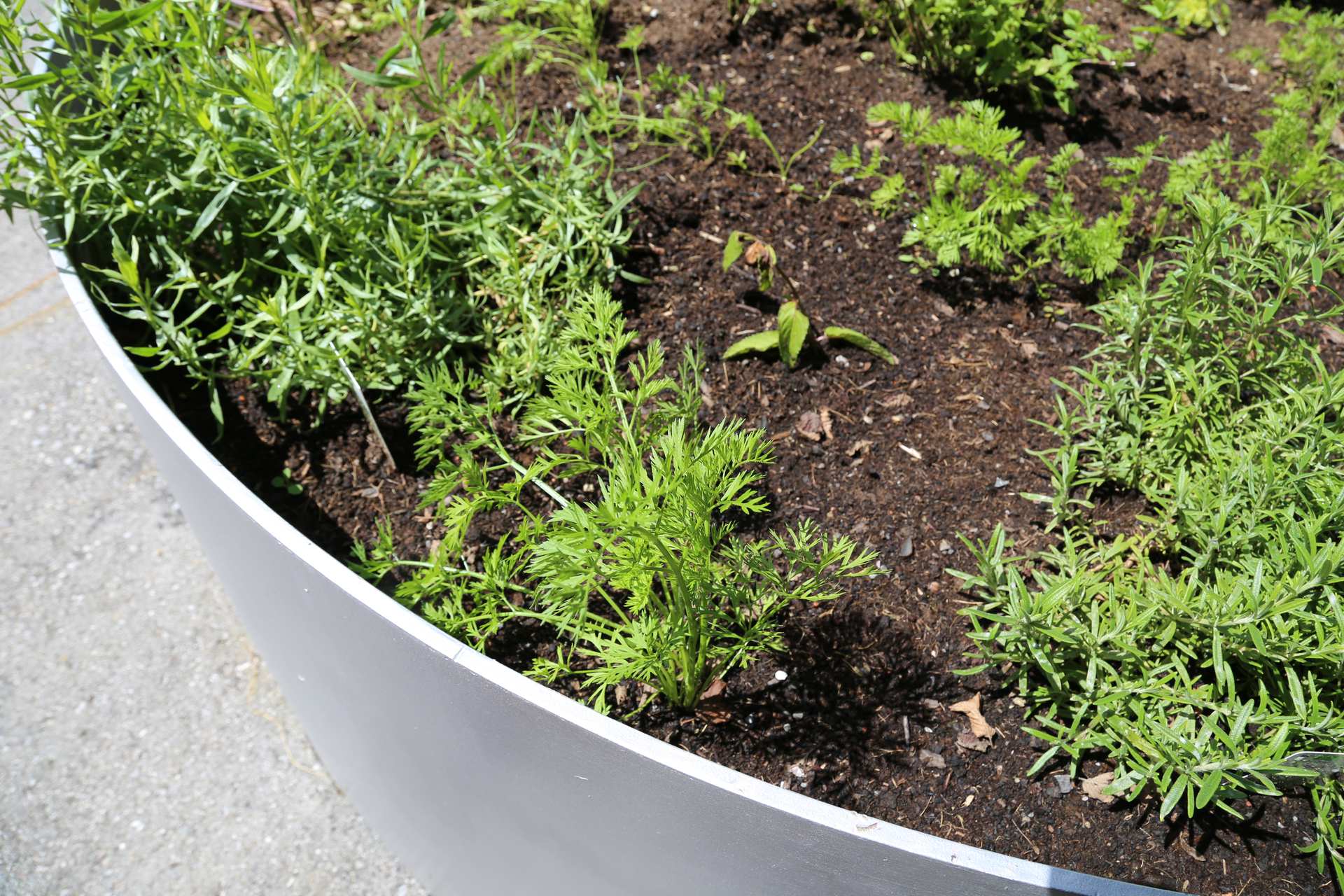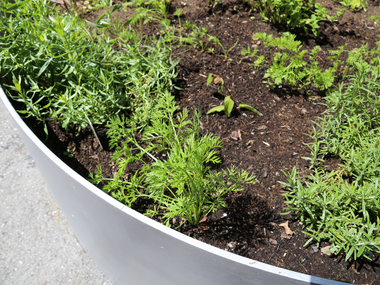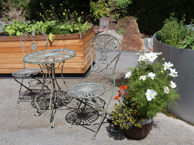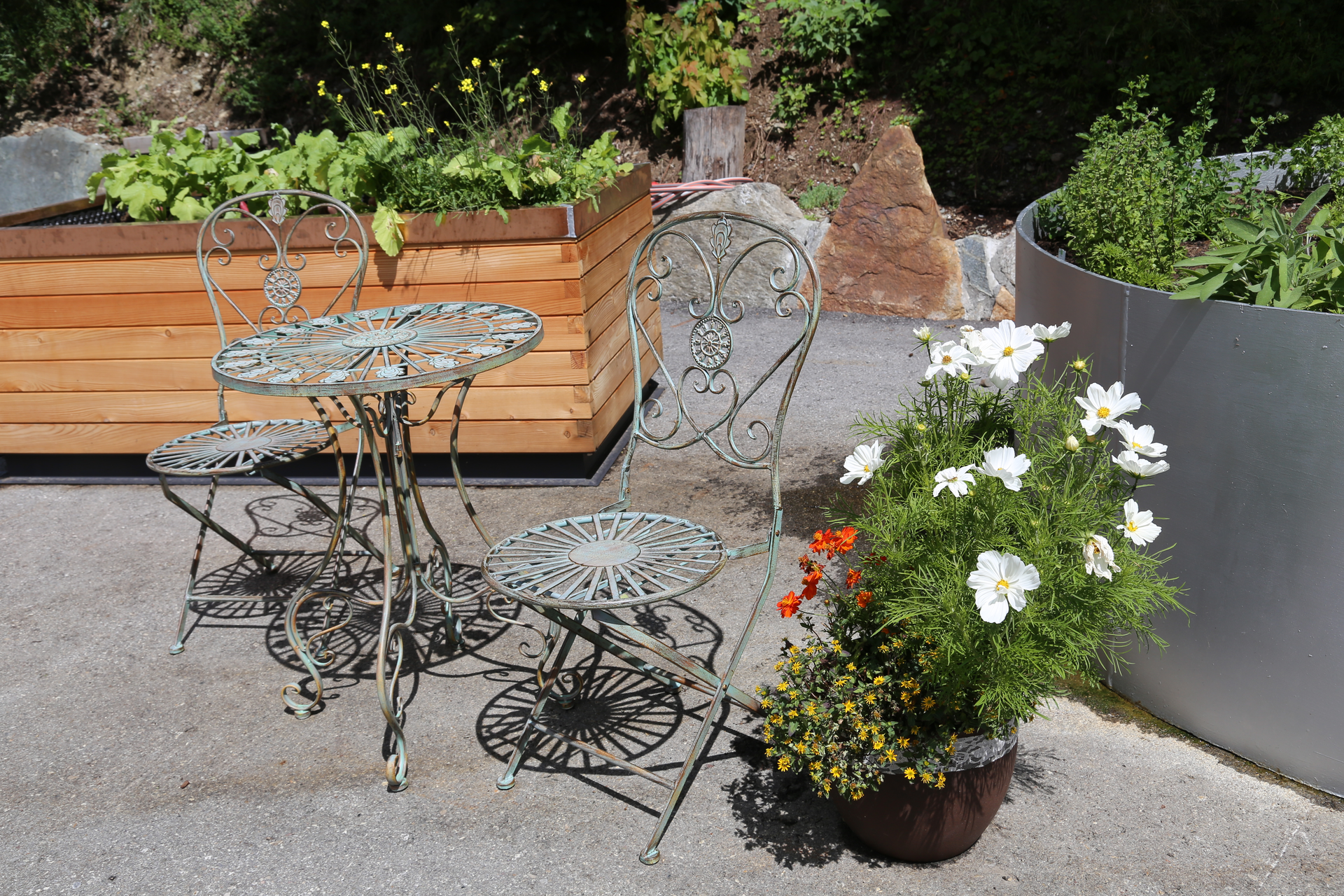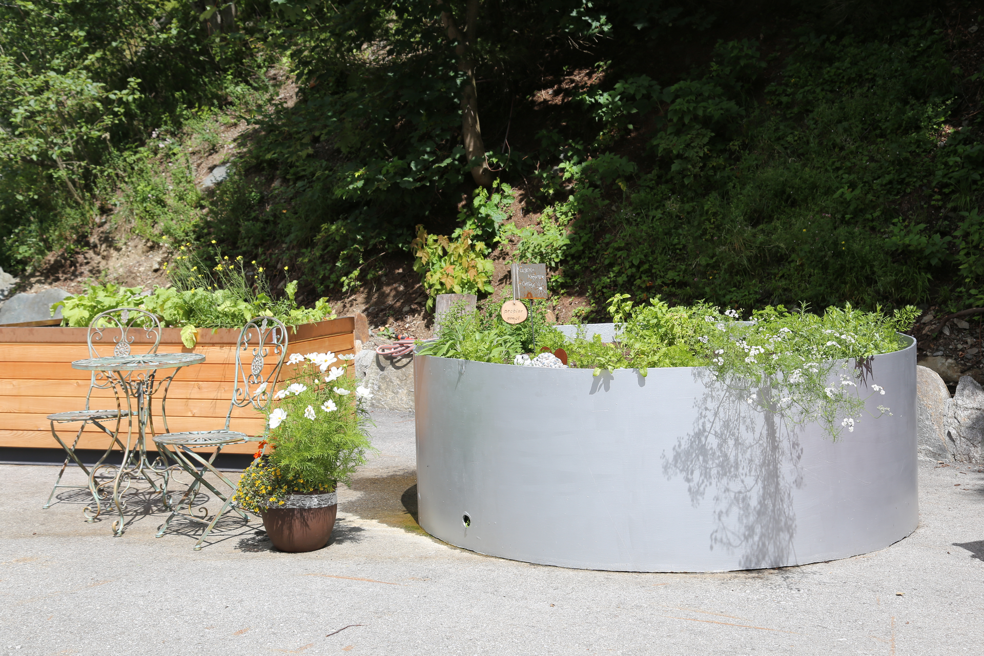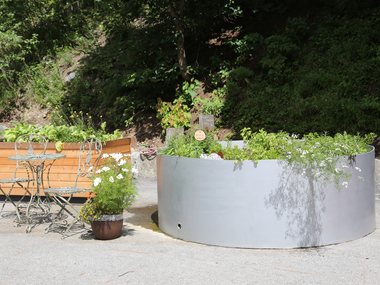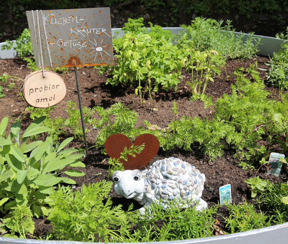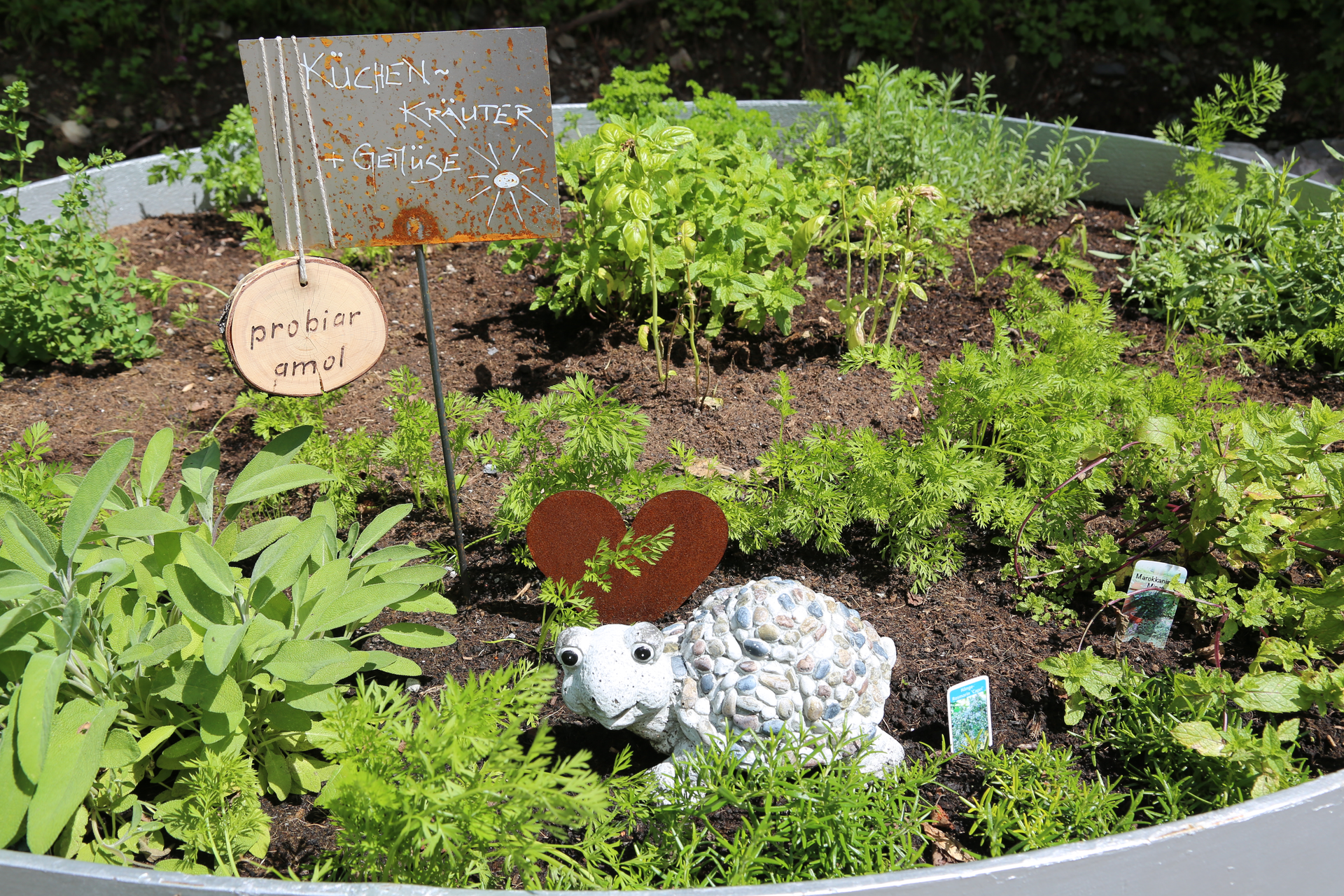 Hinweis: Der Kräutergarten befindet sich links vom "Hotel Zerres" am Ende des Vorplatzes in einer großen runden Wanne. Zwei Stühle zum Ausruhen stehen auch bereit.