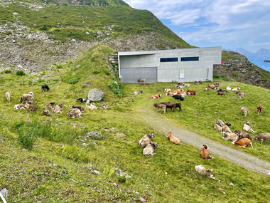 Auf der Alpe verbringen Milchkühe, Jungvieh, Kälber, Hühner, Enten und Schweine ihre Sommerfrische.Aus der Milch wird Frischkäse, Topfen und Joghurt erzeugt.