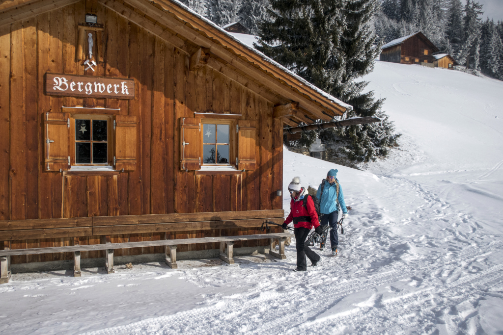 Nun gehst Du links am See entlang und folgst dem Almeinweg weiter bergwärts zur Alphütte. Gehe nun nach links, weiter bergwärts. Der nächste Anhaltspunkt ist die gut versteckte Jagdhütte, welche auch der höchste Punkt der Schneeschuhwanderung ist. Bei schönem Wetter und klarer Sicht hast Du von hier ein herrliches Rundumpanorama. Von hier aus führt der Weg gemütlich und leicht bergab zum Alpengasthaus Rellseck. Das Alpengasthaus Rellseck lädt zu einer Stärkung in großartiger Kulisse ein. Bevor der Abstieg gestartet wird, lohnt sich ein Kleidungswechsel beim Gasthaus zu machen.