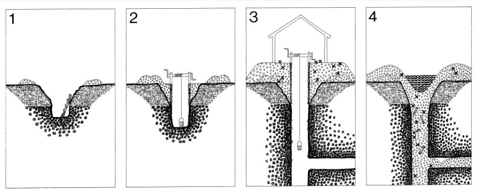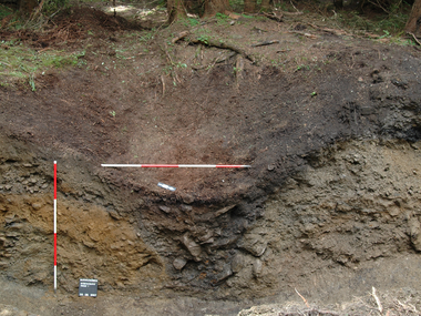 Im Profil erkennt man deutlich die sekundäre Verfüllung des Schachtes aus dunklem, humosem Material, rechts und links davon ist die ringförmige Halde angeschüttet (Abb. 28). Das Ende des Schachtes konnte in dem Profilgraben in etwa 3-4 Meter Tiefe nicht erreicht werden. Zur Klärung des Alters dieses Bergbaus wurden auf beiden Seiten des Schachtes von der alten Oberfläche (links des Schachtes) bzw. aus einem undeutlich zu definierenden Bereich (rechts des Schachtes), der möglicherweise zu einer älteren Bergbautätigkeit oder aus verlagertem Material stammt, je zwei Holzkohlen datiert. Zwei Messungen datieren kalibriert in das 11./12. Jahrhundert n. Chr., also in das Hochmittelalter.