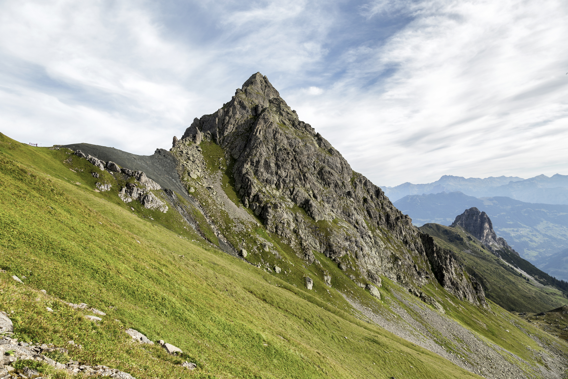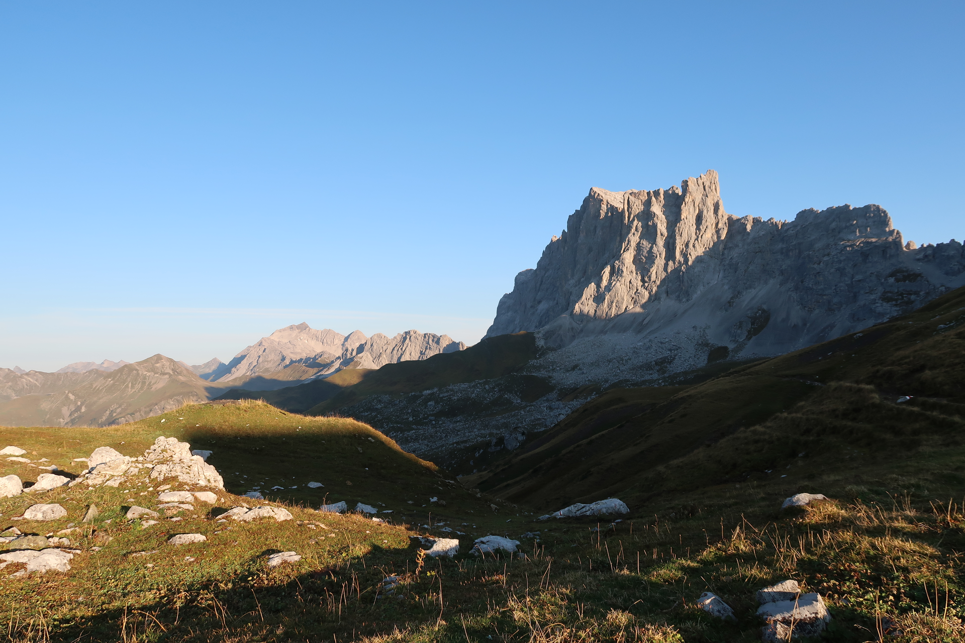 Auf dem Weg zur Lindauer Hütte (1.744 m) richtet sich der Blick immer wieder hinauf zu den imposanten Kalkspitzen von Drusenfluh, Drei Türmen und Sulzfluh, die den Horizont am Ende des Gauertals wie Haifischflossen aussehen lassen.