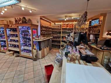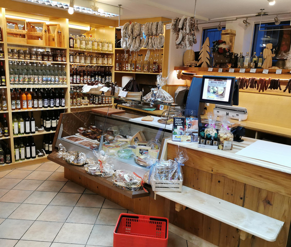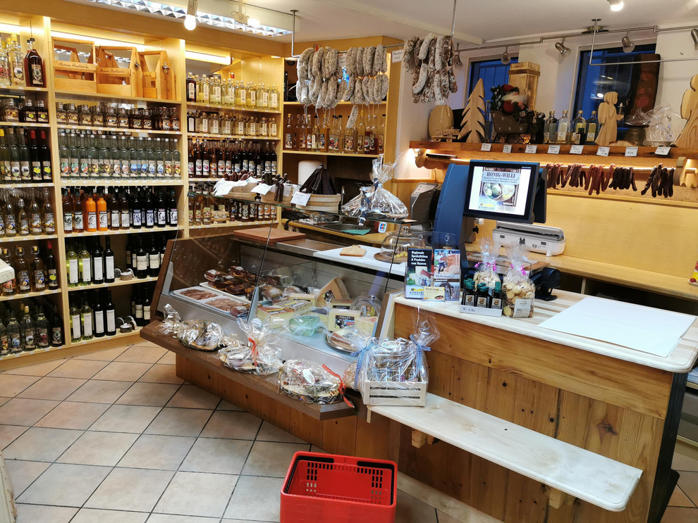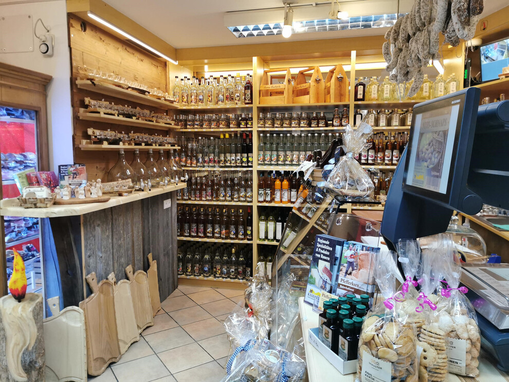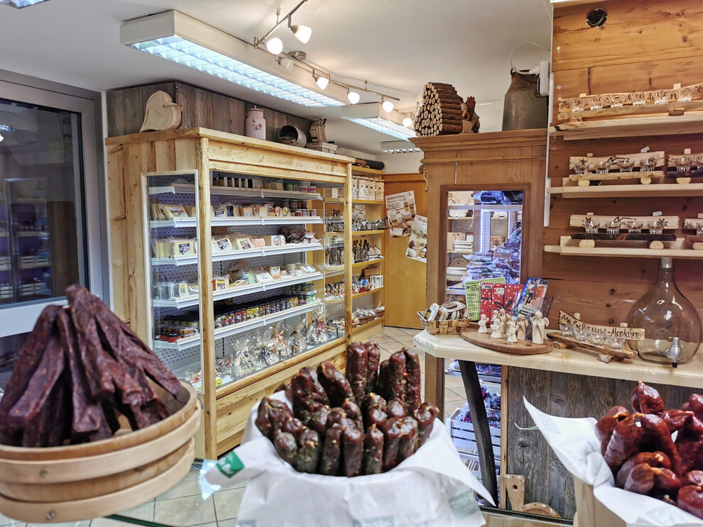 Alp- und Bergkäse, Butter, Speck, Würste, Honig, Schnäpse, Marmeladen, Geschenkkörbe und Verkostungsecke.