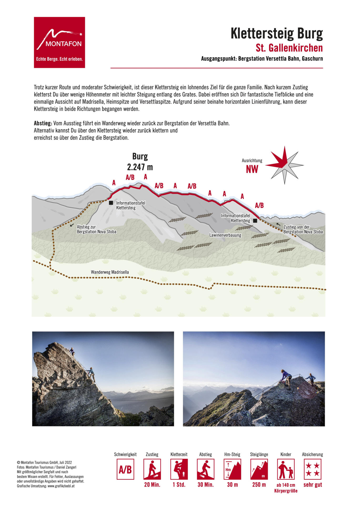 Trotz kurzer Route und moderater Schwierigkeit, ist dieser Klettersteig ein lohnendes Ziel für die ganze Familie. Nach kurzem Zustieg kletterst Du über wenige Höhenmeter mit leichter Steigung entlang des Grates. Dabei eröffnen sich fantastische Tiefblicke und eine einmalige Aussicht auf Madrisella, Heimspitze und Versettlaspitze. Aufgrund seiner beinahe horizontalen Linienführung, kann dieser Klettersteig in beide Richtungen begangen werden.
