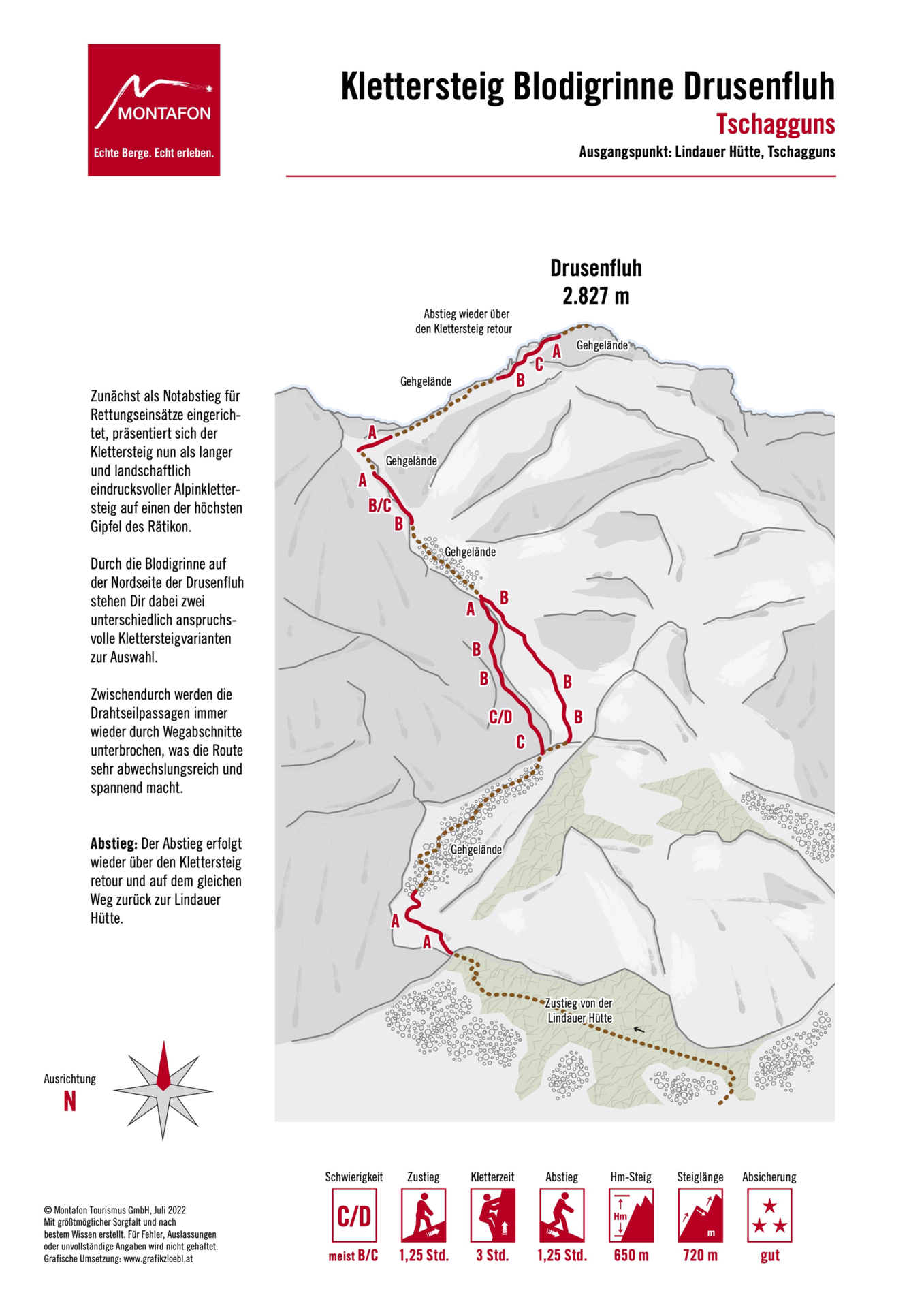 Zunächst als Notabstieg für Rettungseinsätze errichtet, präsentiert sich der Klettersteig nun als langer und landschaftlich eindrucksvoller Alpinklettersteig auf einen der höchsten Gipfel des Rätikon. Durch die Blodigrinne auf der Nordseite der Drusenfluh stehen Dir dabei zwei unterschiedlich anspruchsvolle Klettersteigvarianten zur Auswahl. Zwischendurch werden die Drahtseilpassagen immer wieder durch Wegabschnitte unterbrochen, was die Route sehr abwechslungsreich und spannend macht.