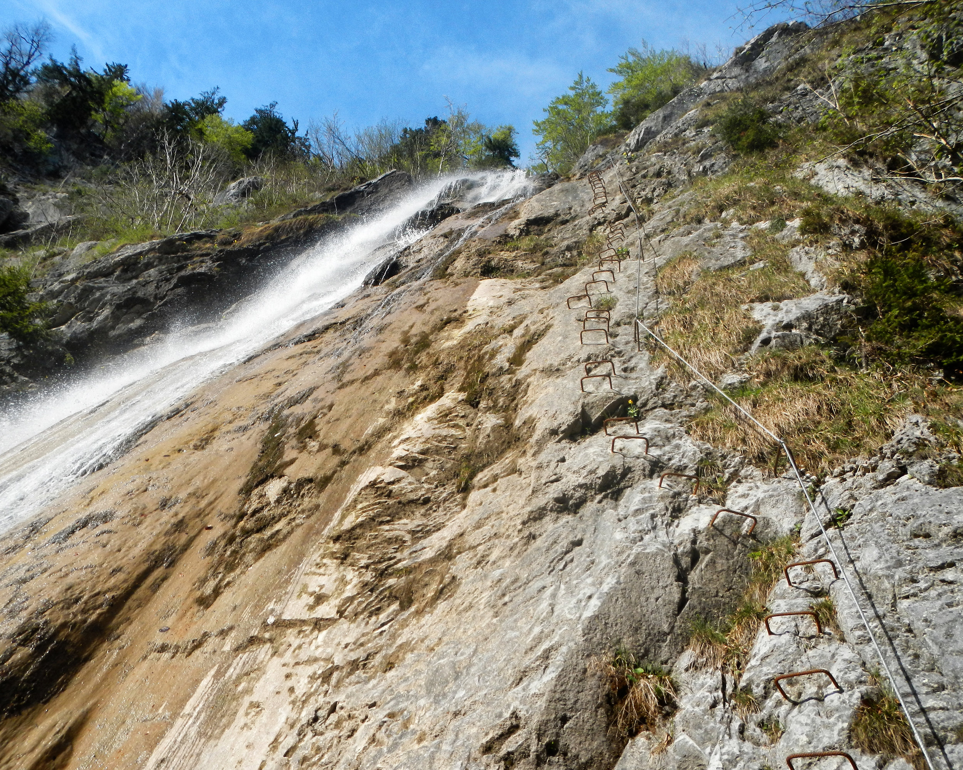 Klettern entlang des Wasserfalls oberhalb von St. Anton im Montafon