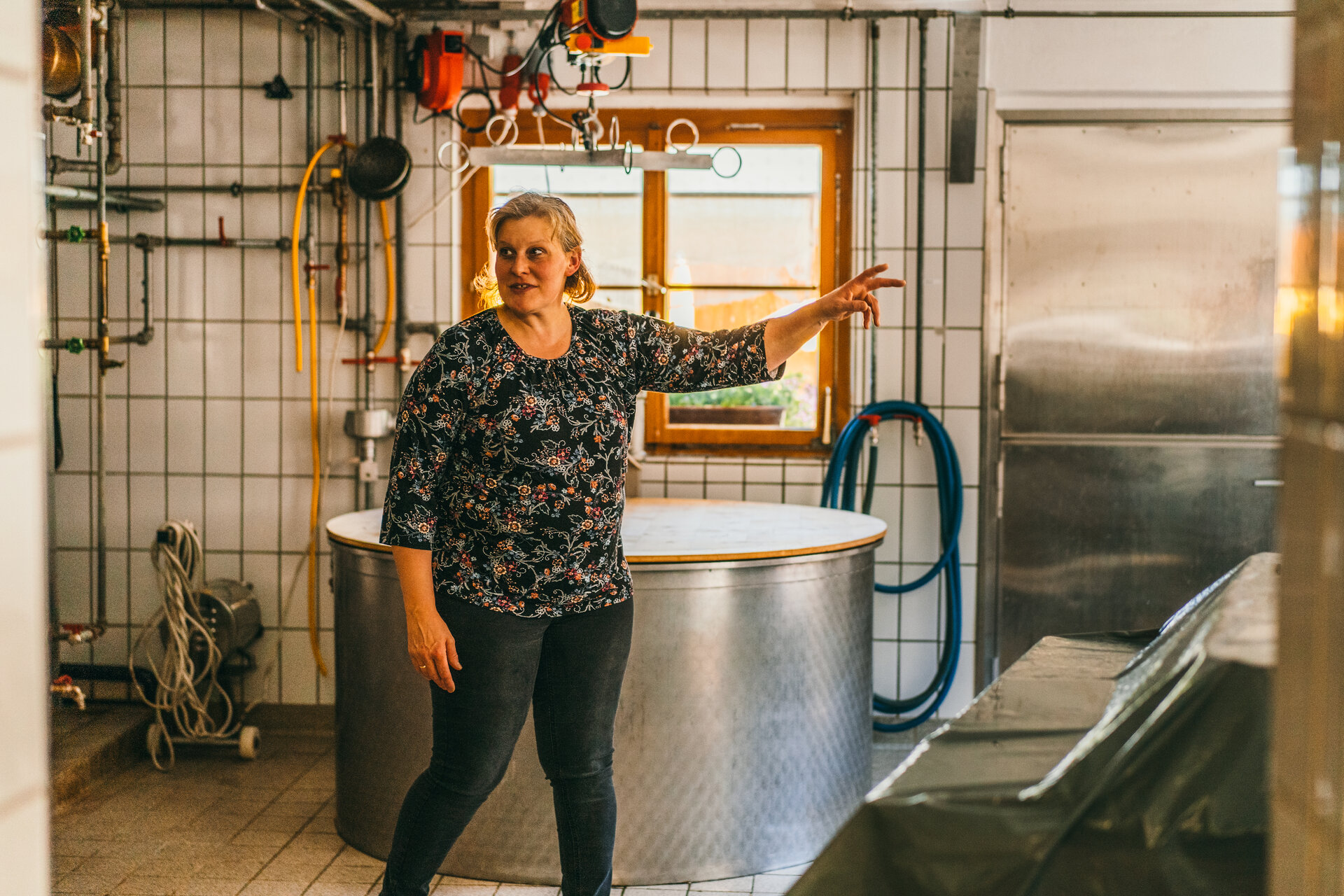 Auf der Alpe Nova treffen wir uns mit Andrea der Bei-Sennerin. Sie und ihre Familie betreiben die Alpe im Sommer von Mitte Juni bis Anfang September. Ihr Mann arbeitet als Senner auf der Alpe und auch der Sohn hilft schon bereits kräftig als Junghirte mit. Der Tag startet um 4 Uhr morgens und endet erst spät am Abend, denn auf der Alpe gibt es einiges zu tun. Die Alpe Nova ist eine Genossenschaft und hat 70 Kühe und 8 Schweine von 25 verschiedenen Bauern. „Pro Sommer werden auf der Alpe Nova etwa 80.000 Liter Milch verarbeitet“, erzählt uns Andrea. Daraus werden zum Beispiel Bergkäse, Butter und Sura Kees (der typische Käse aus dem Montafon) gemacht. Wir sind erstaunt wie vielseitig Sura Kees ist. Der Geschmack erinnert uns an milden Frischkäse. Aber Andrea erzählt uns, dass der Käse immer saurer und kräftiger wird, je länger man ihn stehen lässt. Und wie macht man Sura Kees?