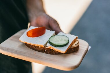 Andrea lacht: „Sura Kees kann man nicht lernen, nur erfahren. Man braucht jahrelange Erfahrung damit der Käse so gut wird – in einer Schule lernt man das nicht.“ Zum Abschluss essen wir unter dem Sonnenschirm noch Sura Kees auf Brot und Erdbeer-Buttermilch zum Probieren - einfach köstlich.