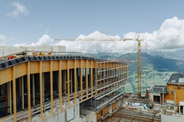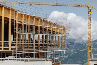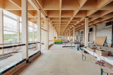 Die Fenster im Erdgeschoss sind eingebaut und die Holzkonstruktion für die Pfosten-Riegel-Fassade ist fertiggestellt. Im August folgt der Einbau der Glaselemente, die dem Gebäude ein modernes und lichtdurchflutetes Erscheinungsbild verleihen werden.