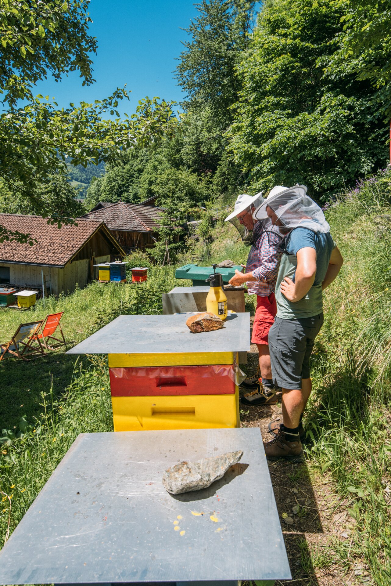 Am Ende der Wanderung kommen wir in Schruns an. Dort stehen Harrys Bienenstöcke. Erst erklärt er uns, wie Bienen gezüchtet werden und wie der Imker zu seinem Honig kommt. Wir waren ganz überrascht – ein Bienenstock beherbergt etwa 50.000 Bienen und jede Biene fliegt etwa drei Mal täglich los, um Nektar und Pollen zu sammeln. Wir wollen uns die Honigbienen aus der Nähe ansehen und ziehen uns einen Imkerhut über. Wir schauen in die Bienenstöcke und in einer Wabe entdecken wir sogar eine Bienenkönigin. Während die Arbeiterbienen nur etwa sechs Wochen leben, kann eine Königin etwa fünf Jahre alt werden. Dabei legt sie über den Sommer etwa 1.500 Eier pro Tag und verbraucht dabei unglaublich viel Energie. Harry ist Imker aus Leidenschaft und das merkt man auch. Wir haben viele Fragen und er beantwortet sie alle, bevor die Imkerwanderung zu Ende geht.
