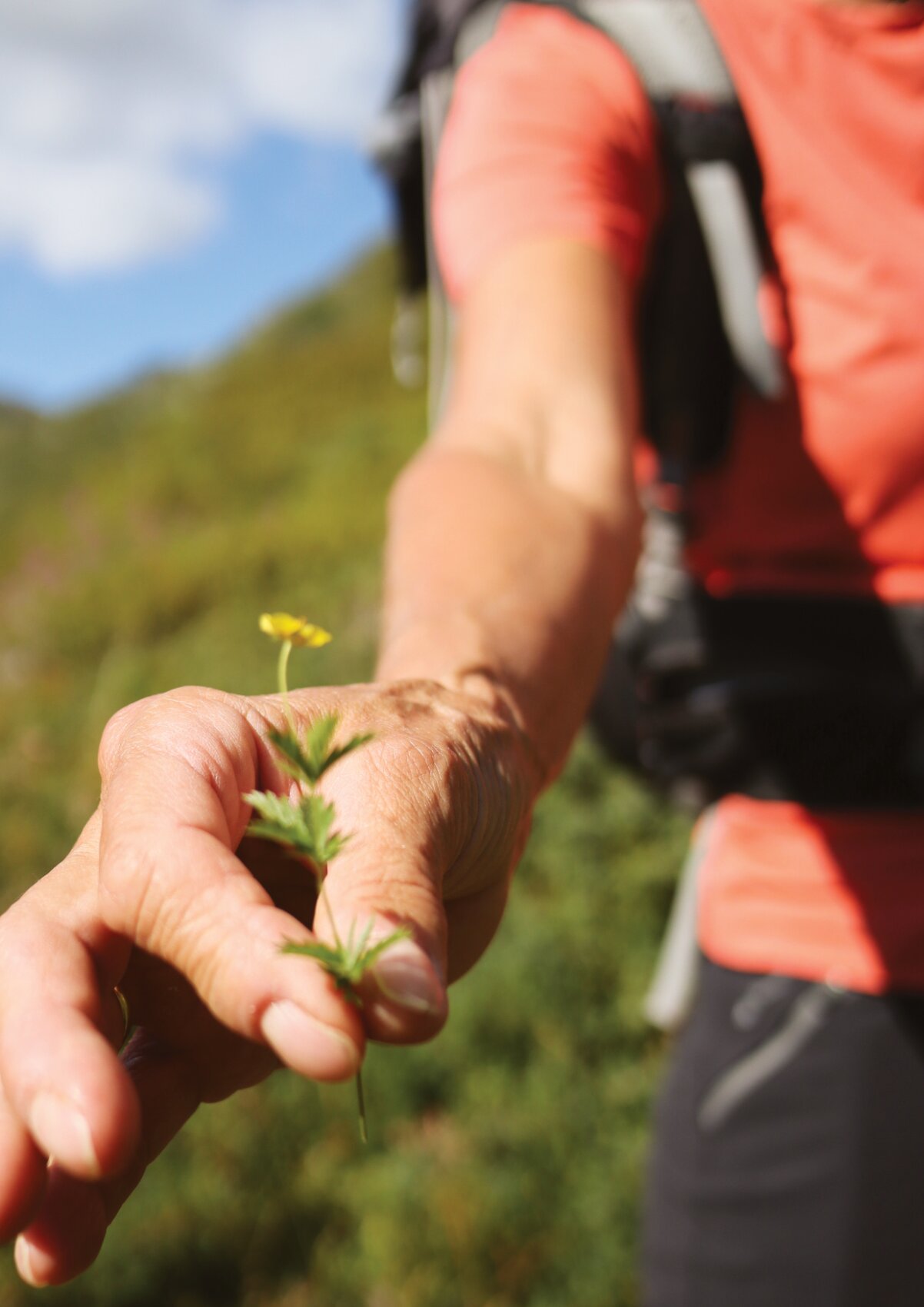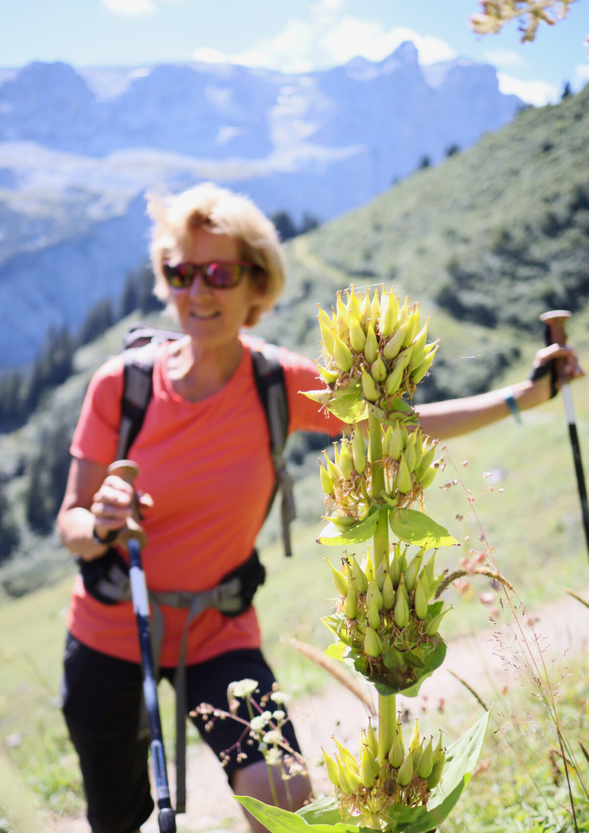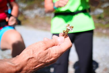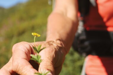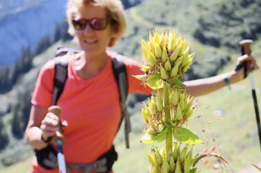 Wer mit offenen Augen die Gauertaler AlpkulTour wandert, dessen Blick bleibt unweigerlich an den ungewöhnlichen Skulpturen hängen. Wer aber noch etwas genauer hinsieht, dem fällt auf, dass die umliegenden Wiesen mit leuchtenden Alpenblumen und Gebirgskräutern geschmückt sind. Sei es die bärtige Glockenblume, das Johanniskraut, die heilende Arnika, die Klettendistel, die Alpenglockenblume oder die wunderschöne Alpenrose. Die Montafoner Bergwelt strahlt nur so in ihrer großen Vielfalt an Alpenblumen und -kräutern. Wanderführerin Monika hat ein besonderes Auge für die Alpenblumenwelt und viel Freude daran, dies an ihre Gäste weiterzugeben.