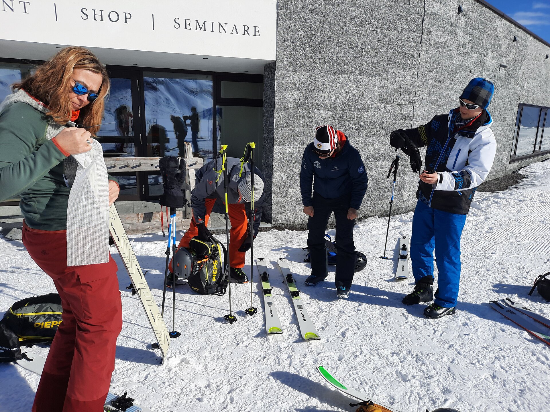 Wir lernen Felle aufzuziehen und die Bindung und Schuhe richtig einzustellen. LVS-Gerät korrekt umgebunden, aktiviert auf „Senden“ und los geht’s – nachdem Jonny noch die Funktion unser LWS-Gerät sichergestellt hat. Check.