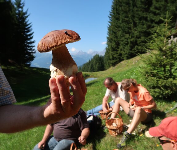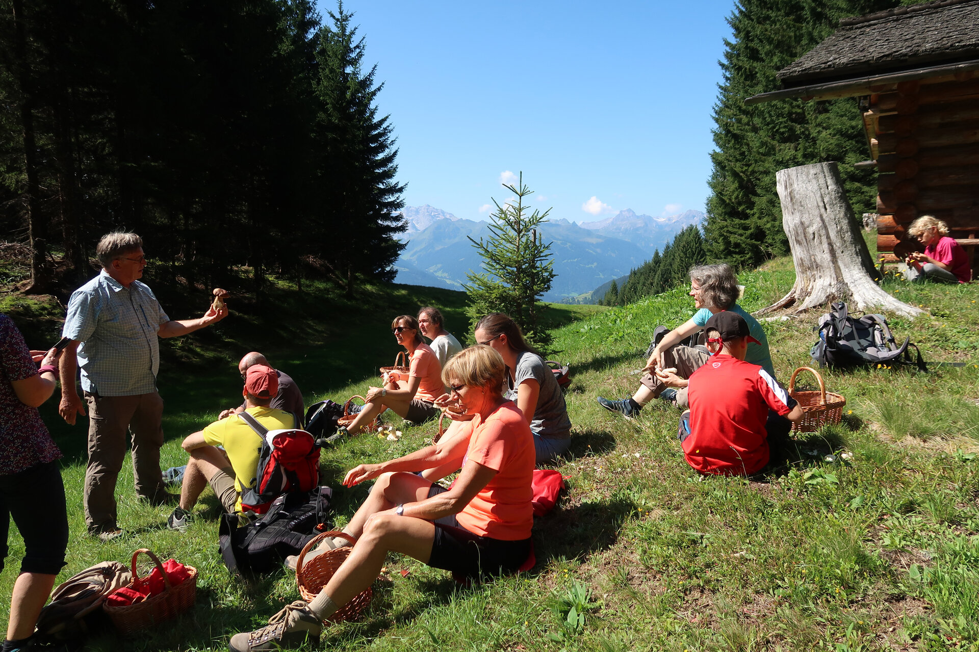Überrascht war ich von der Vielfalt, die es bei uns im Montafon zu finden gab. Mit Hilfe unseres Büchleins konnten wir die Pilze gut identifizieren und giftige Exemplare gleich ausschließen. Trotzdem warf Harry noch einen prüfenden Blick auf alles Gesammelte. Nach etwa zwei-stündiger Suche, waren alle Teilnehmer mit ihrer Ausbeute zufrieden. Auf einer ruhigen Wiese putzten wir die Pilze mit einer Bürste sauber und sortierten nochmal aus.