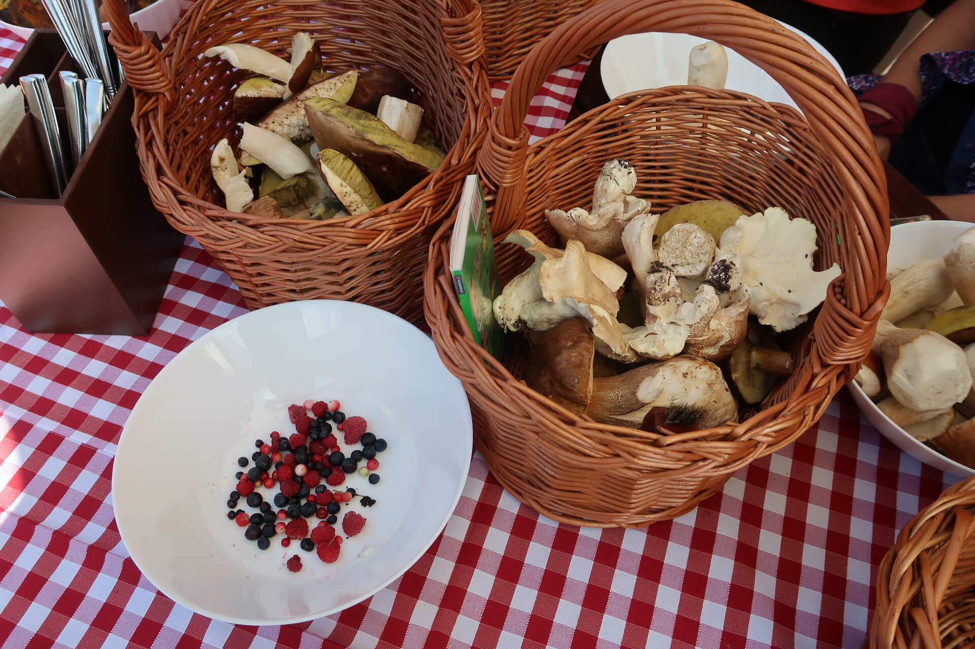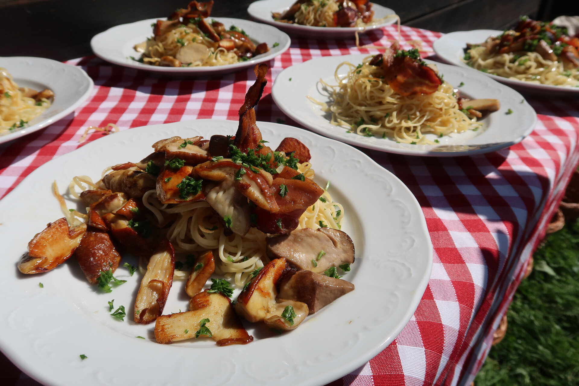 Dann wanderten wir – mit schon großem Hunger – wieder Richtung Panoramagasthof Kristberg. Dort angekommen, waren schon Kochgeschirr und diverse Lebensmittel für uns bereitgestellt. Gemeinsam wurde nun nach Pilzart sortiert und die Pilze zugeschnitten. Harry zeigte uns, wie wir die Pilze am besten zubereiten können. Unser Parasol, den wir am Anfang gefunden haben, wurde in der Küche zu einem Schnitzel zubereitet. Mit dem Rest entstand eine köstliche Sauce aus Kräutern, Zwiebeln, Creme fraîche, Gewürzen und on top: Pilze aller Art. Gemischt mit Nudeln entstand daraus das perfekte Essen. Himmlisch, wenn ich wieder daran zurück denke…