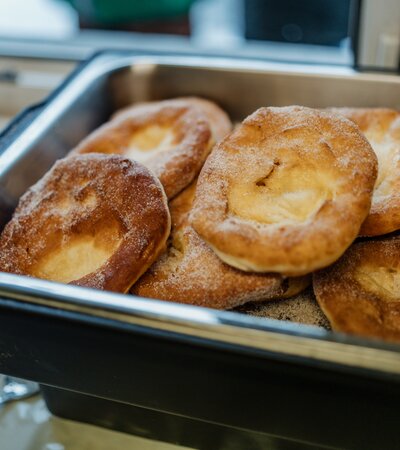 "Damit die süßen Funka-Küachli perfekt gelingen, in der Pfanne immer wieder mit heißem Fett übergießen oder vorsichtig schwenken."