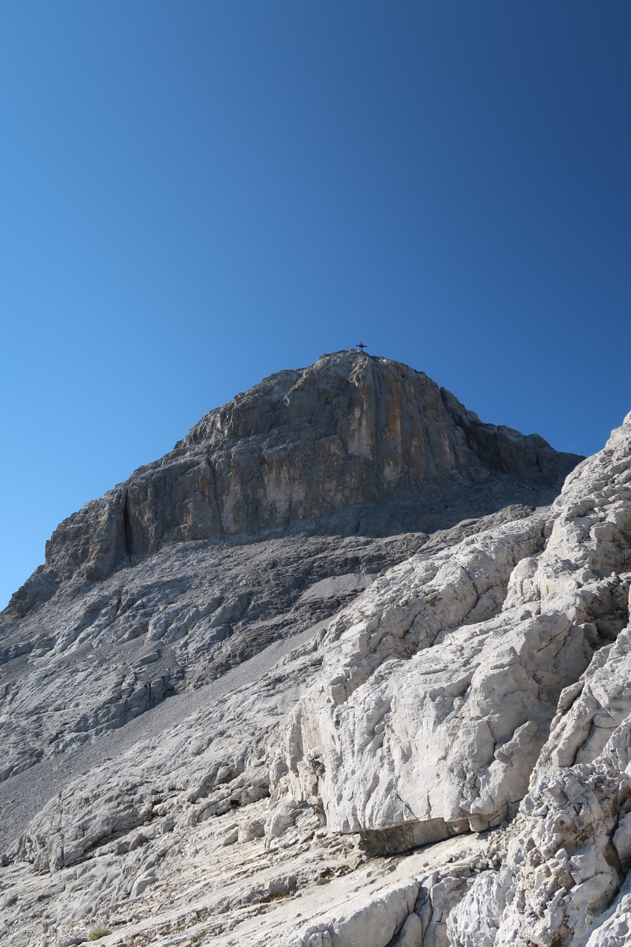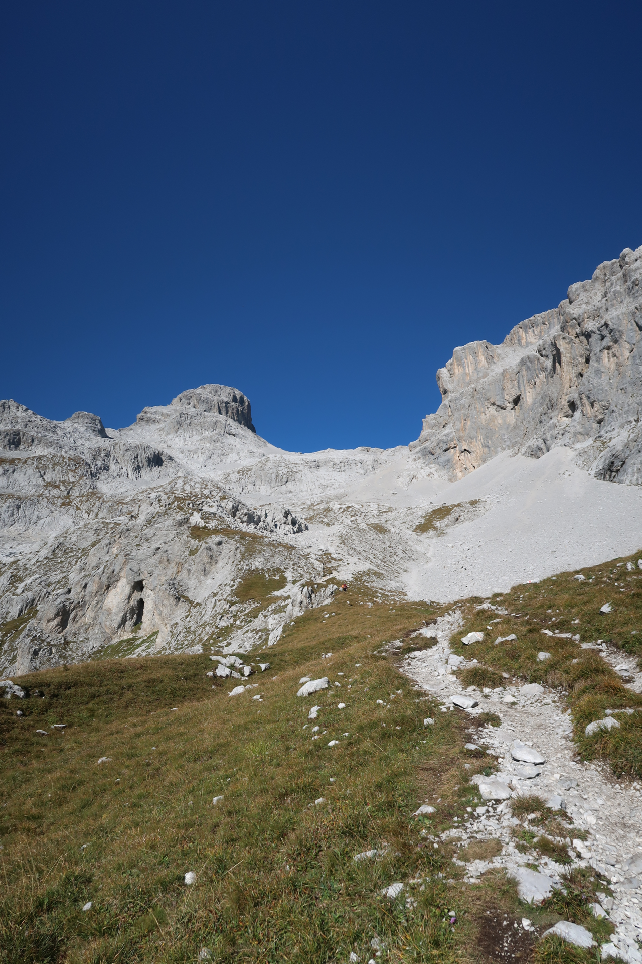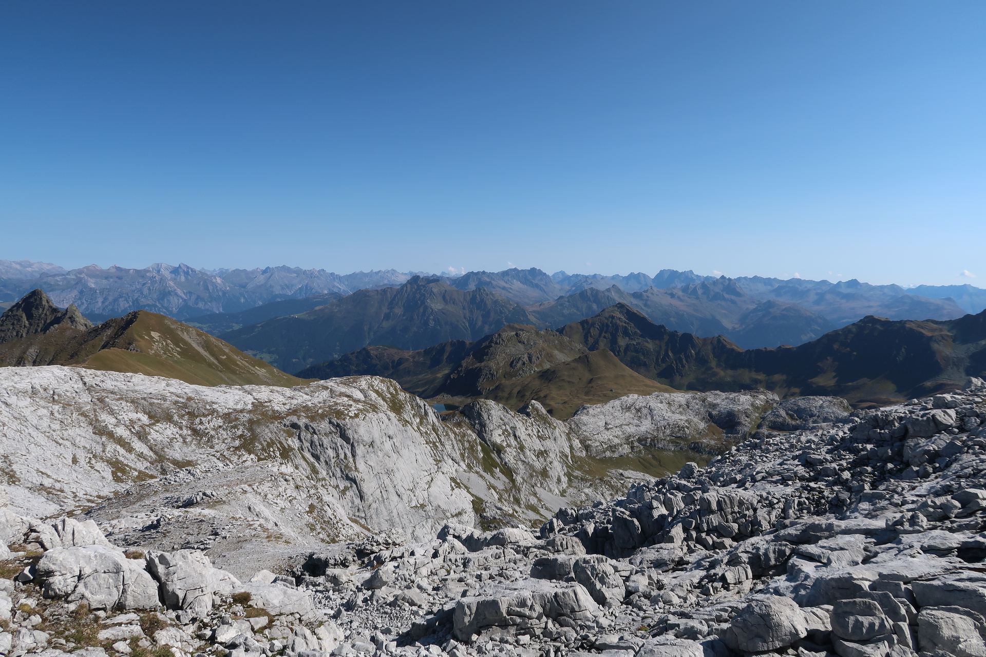 Nach einer kurzen Rast am Gipfel führt der Weg über den weißen Kalk in Richtung Tilisunahütte.