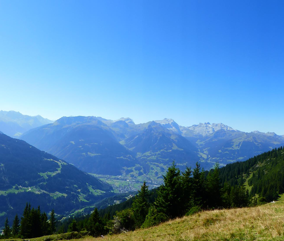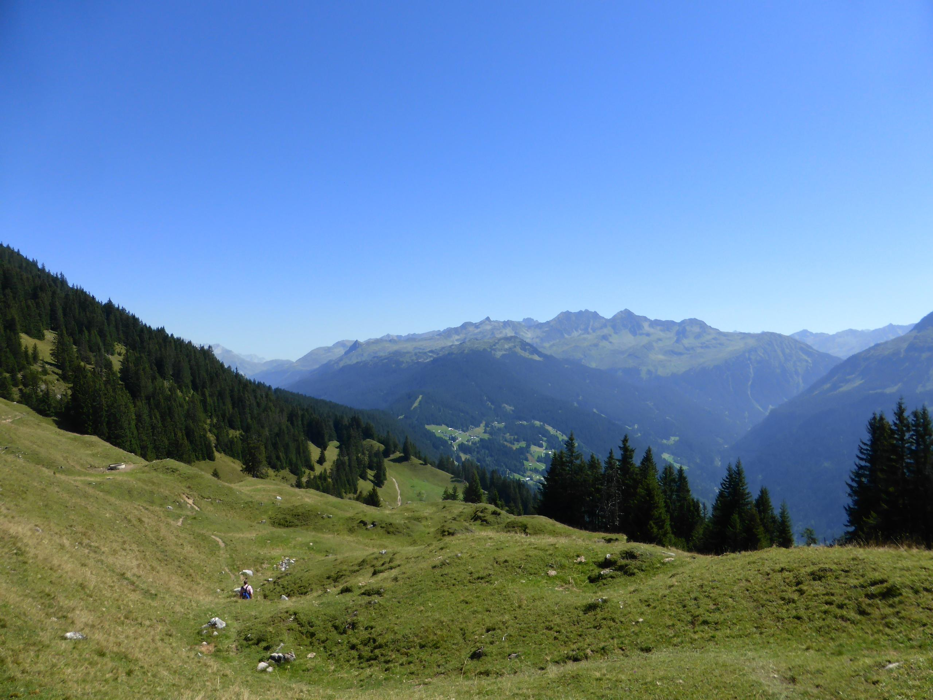 Von der Schautafel 13 haben Sie den Blick gegen Osten zum Arlberg und auf die bewaldeten und begrünten Hänge des Silvrettakristallins auf der südlichen Talflanke und auf die schroffen Steilhänge der Nördlichen Kalkalpen auf der nördlichen Talseite.