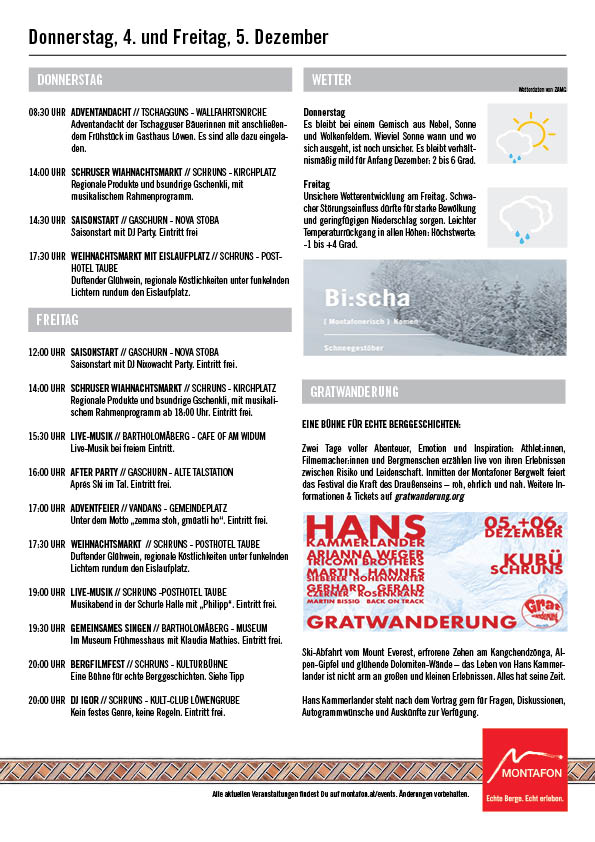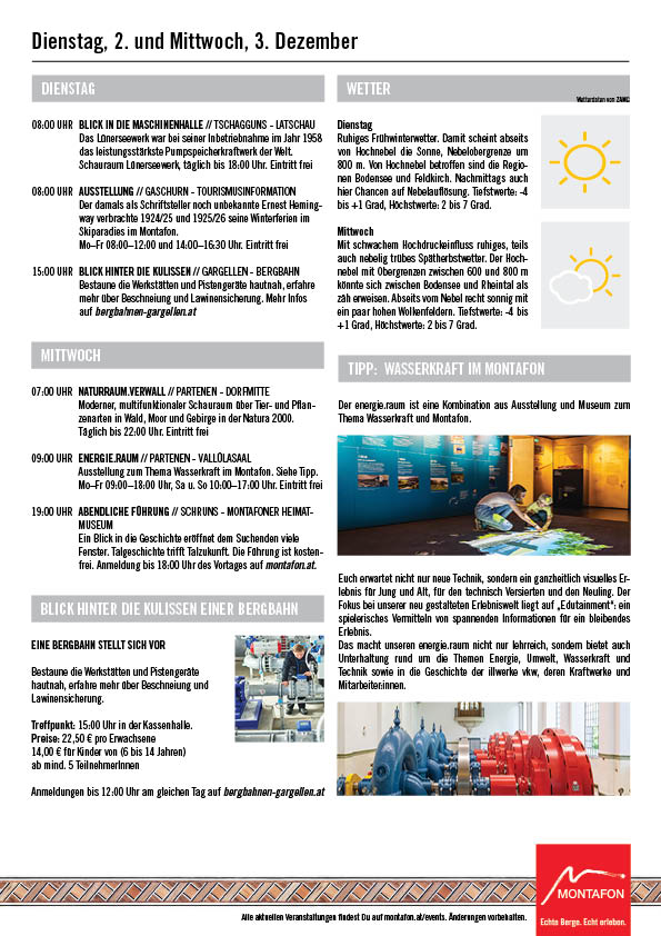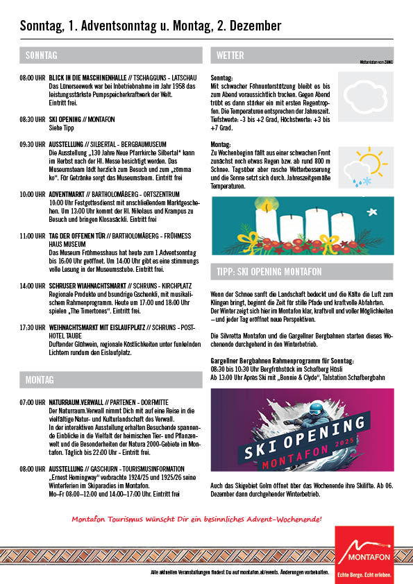 Unser Heute Aktuell ist nicht nur informativ, sondern bringt Dir die Schönheit und das Erlebnis des Montafon näher. Sie hilft Dir, Deinen Tag bestmöglich zu nutzen und wertvolle Erinnerungen zu sammeln. Mit unserem Heute Aktuell bist Du immer bestens informiert und verpasst keine Höhepunkte mehr.