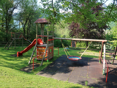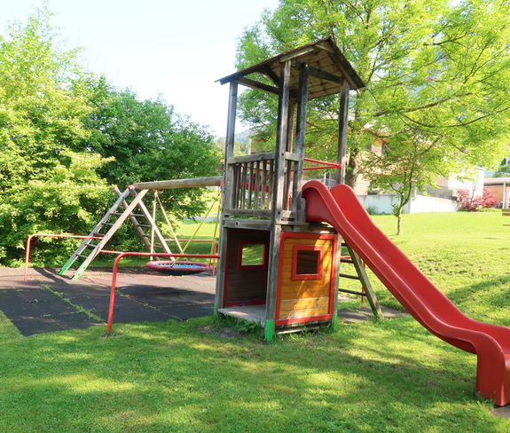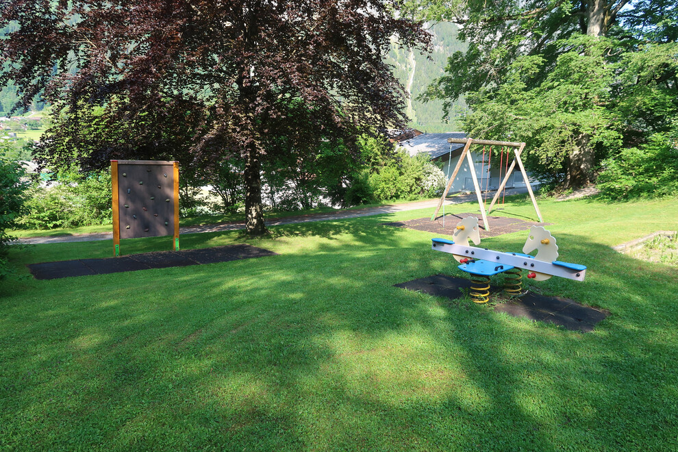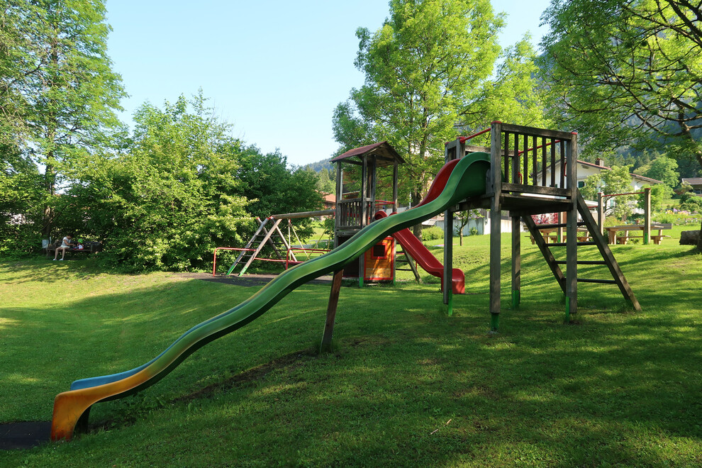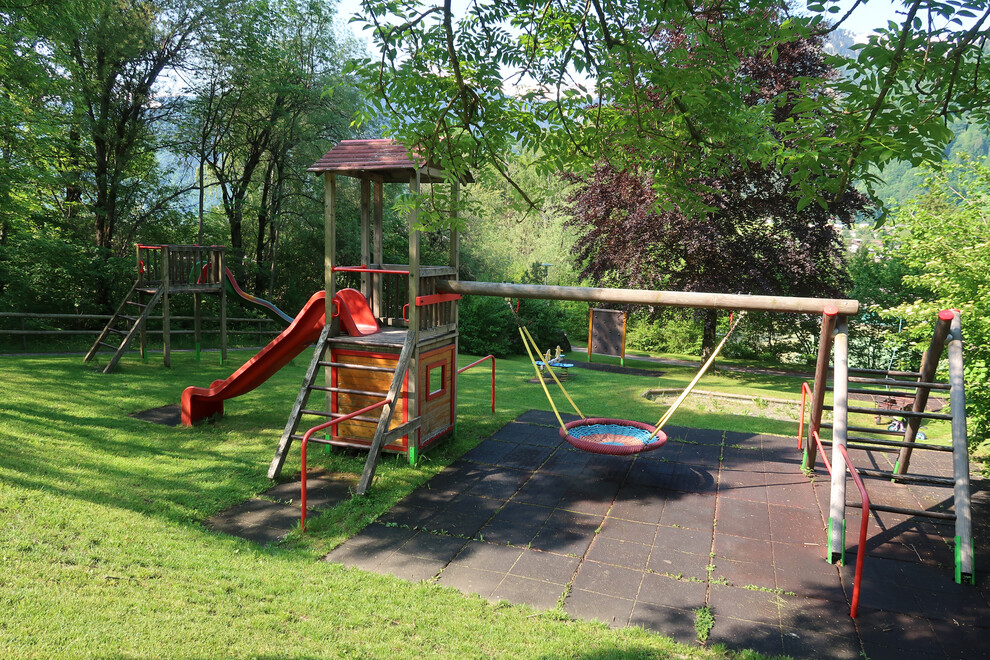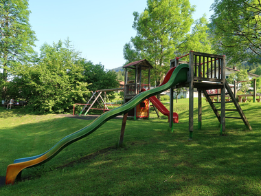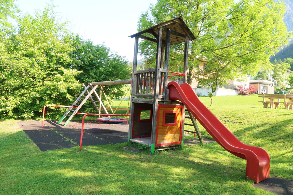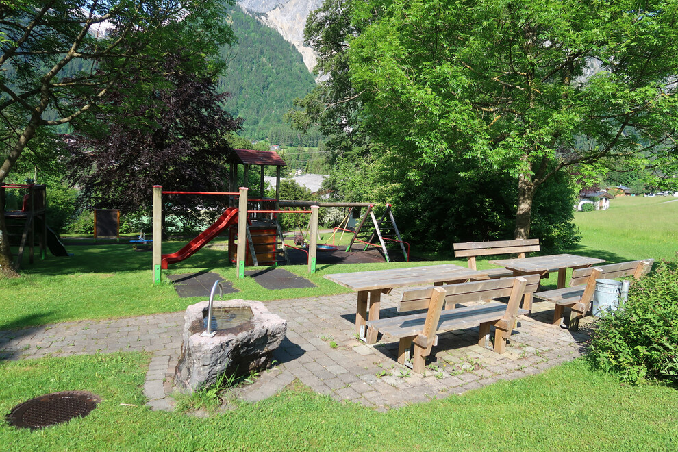 Öffentlicher Spielplatz mit Sitzgelegenheiten und Trinkbrunnen in der Nähe des Gemeindezentrums (oberhalb vom Sportplatz).