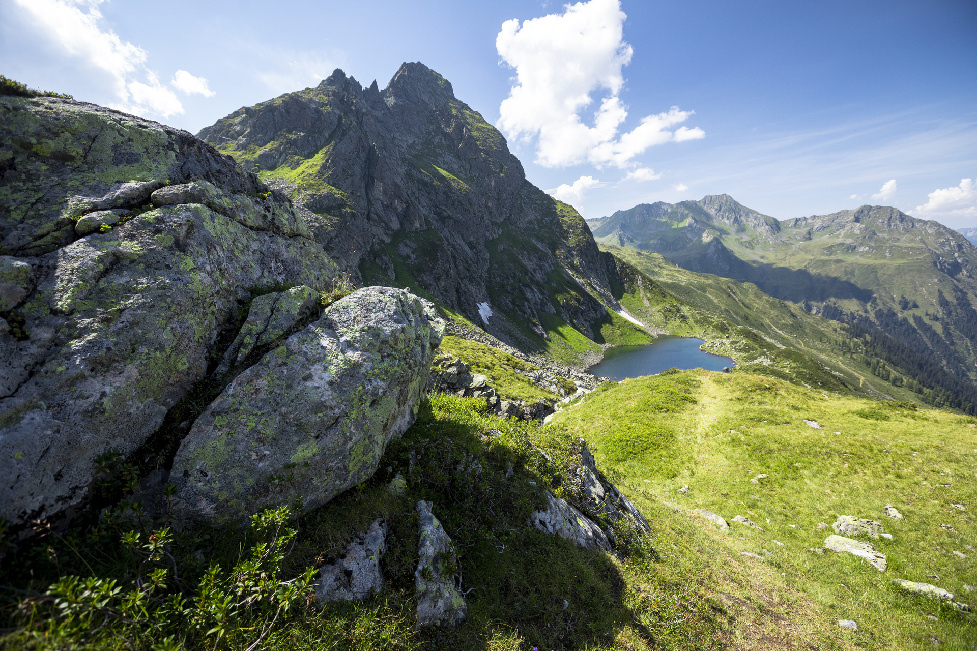 From the starting point at the mountain station of the Grasjoch cable car, the route begins with a short ascent along the Wormser Höhenweg towards Wormser Törl/Scheimersch. Passing the Wormser Törl (below the Scheimersch*), the beautiful Höhenweg with views of St. Gallenkirch leads up to the junction of the Alpgues lakes (2,320 m). From here, the upper Alpgues lake is already clearly visible. The path leads you directly along the lake and further to the lower Alpgues lake past beautiful small waterfalls. From the lower Alpgues lake, the path descends about 260 meters to the valley to the Alpgues alp (lowest point of the hike at 1,720 m). From the Alpgues alp, the path moderately but steadily ascends back to the starting point, the mountain station of the Grasjoch cable car. A stop at the Grasjoch hut with views of the Silvretta mountain range is the crowning finale of this route.