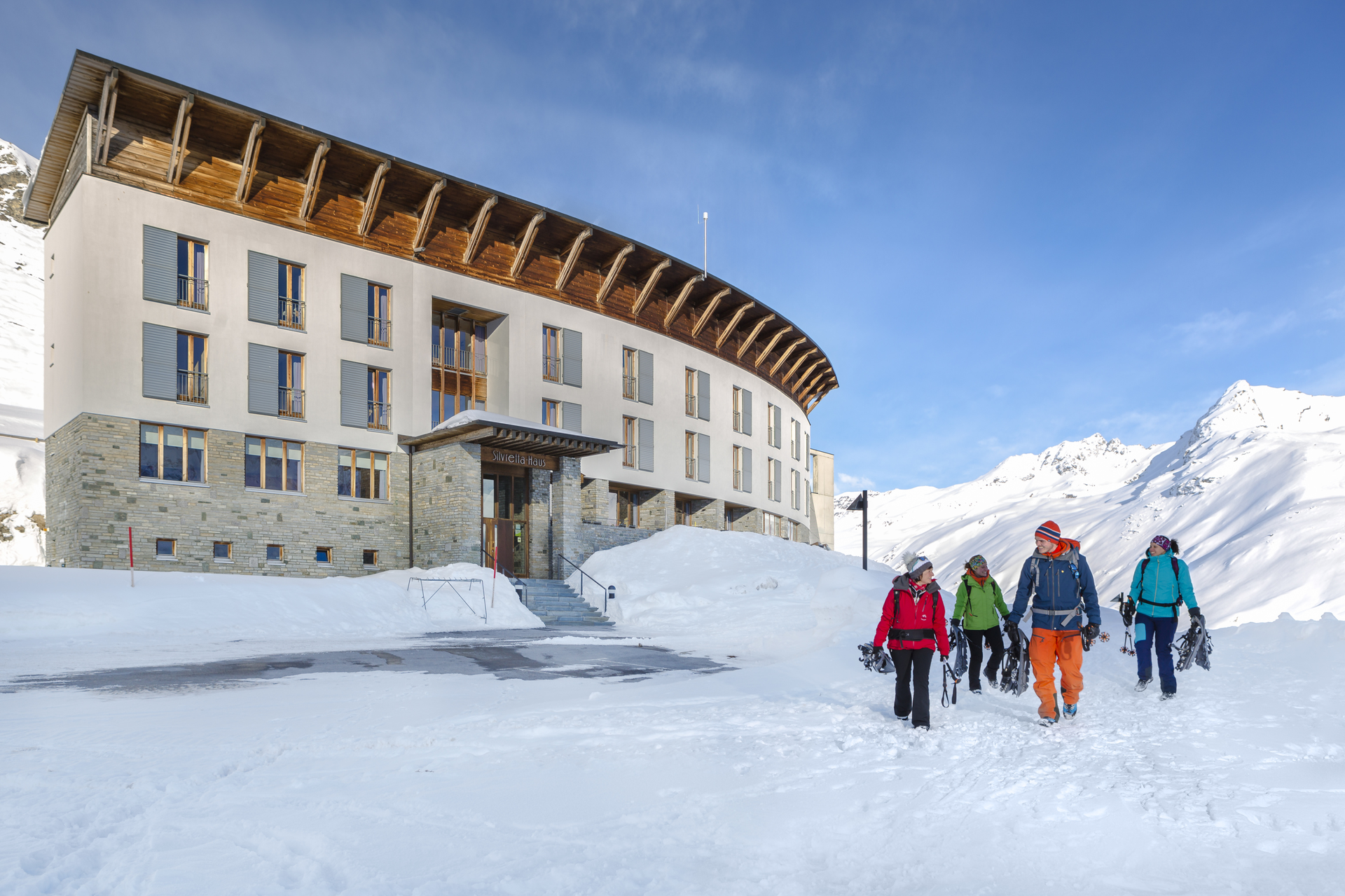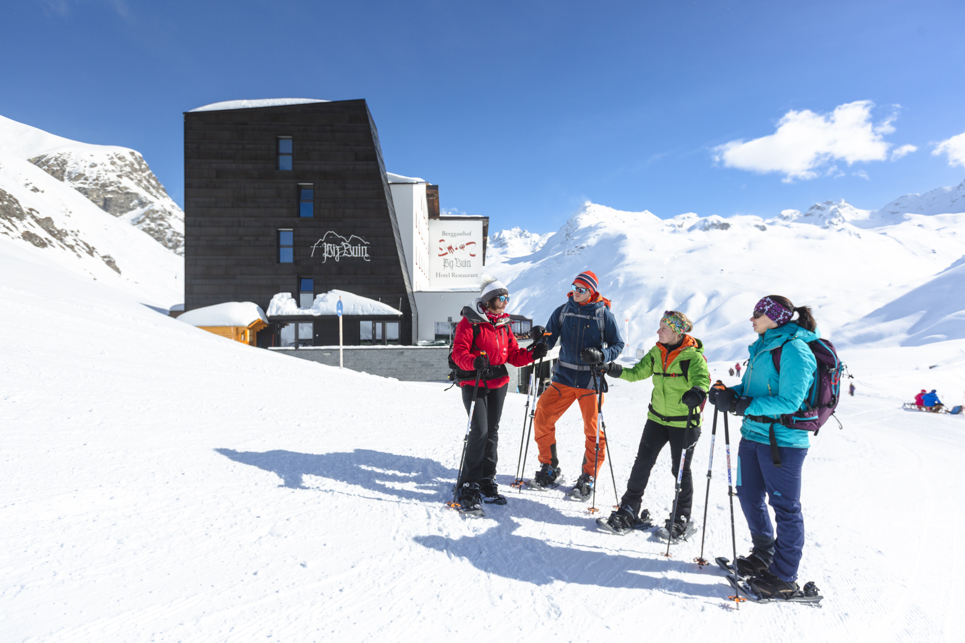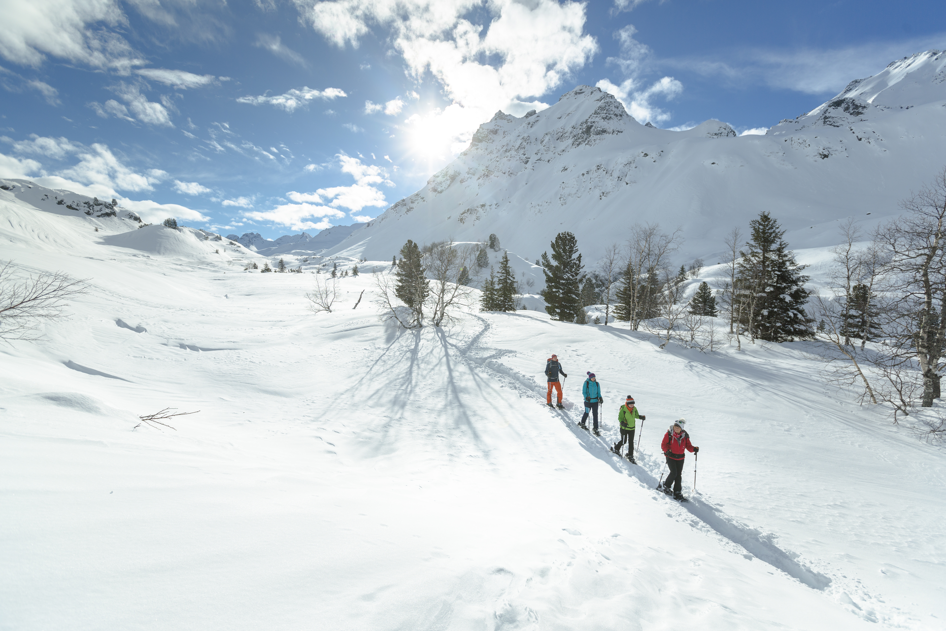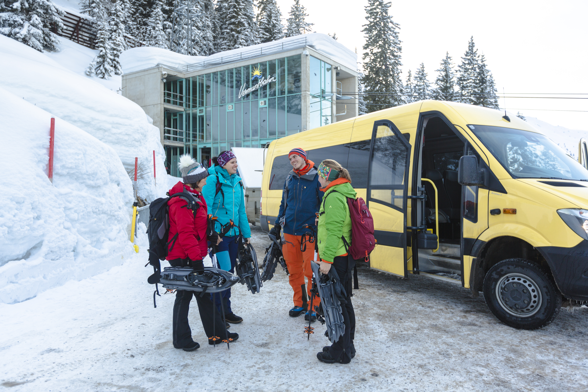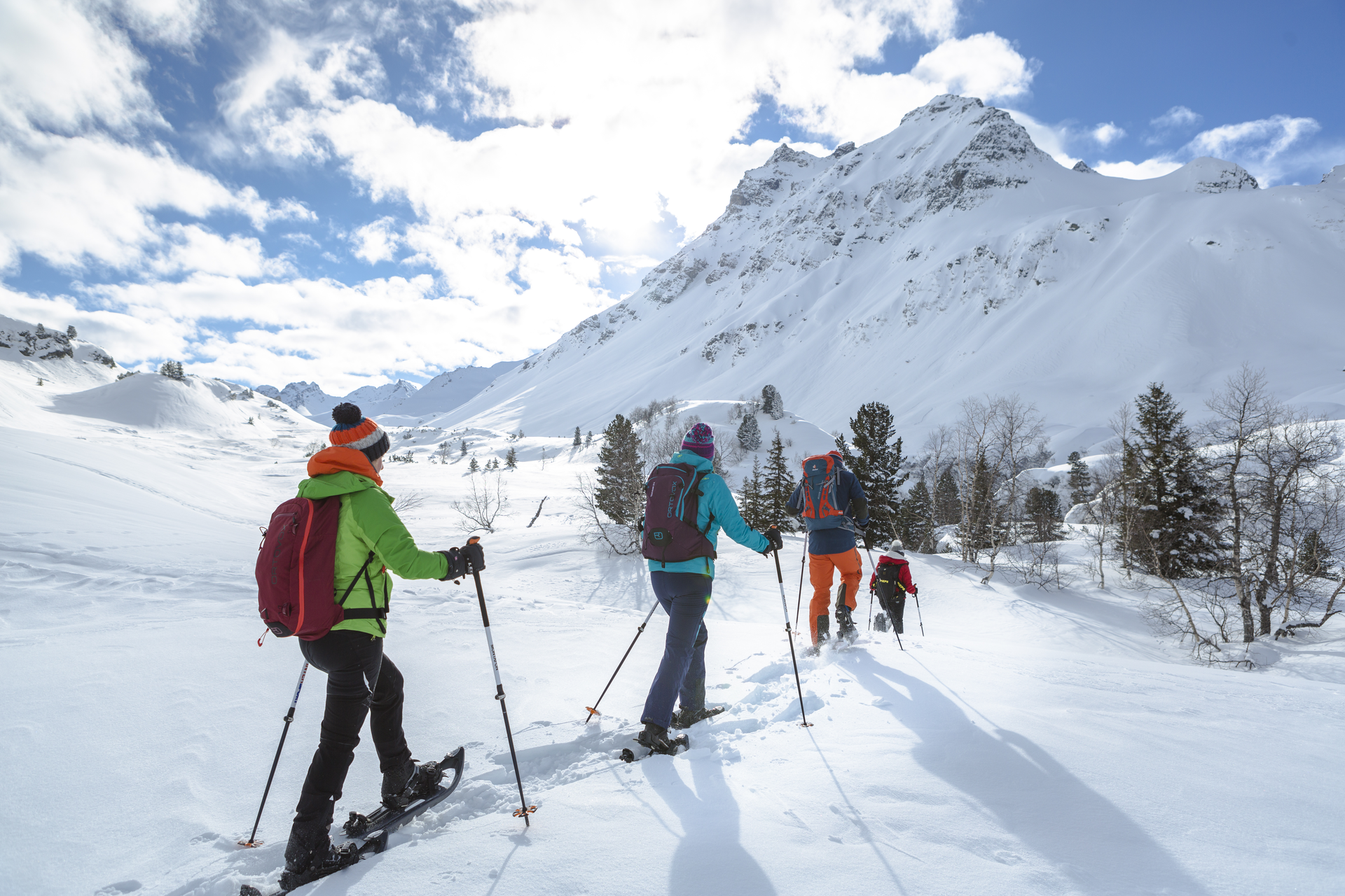 Snowshoes, telescopic poles with large baskets, avalanche equipment with LVS device, avalanche probe and shovel, day hiking backpack (approx. 30 liters) with rain cover, possibly with avalanche airbag, comfortable and waterproof winter boots or sturdy hiking boots that fit into the snowshoe bindings, possibly gaiters, warm and durable clothing in layered system, ski jacket and pants, hat/headband, scarf, gloves, possibly ski goggles, sun and rain protection, provisions and drinking water, thermos with hot beverage, first aid kit, pocket knife, mobile phone, possibly headlamp and reflectors, map material, bivouac sack and rescue blanket.