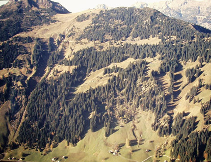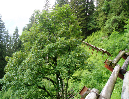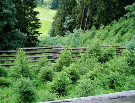 Aussichtspunkt Ganzaläta: Informationen über Schutz vor Steinschlag, Hochwasser, Muren und Lawinen durch Bergwald. Zusätzlicher Schutz durch Verbauungen, Schrinawald.
