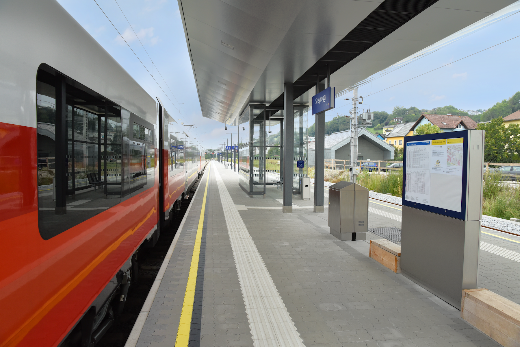 Der neue ÖBB Cityjet hat ein eigenes Rollstuhlabteil mit einer barrierefreien Universaltoilette. Der Einstieg für Rollstuhlfahrer:innen und die Universaltoilette befinden sich dort, wo der Stromabnehmer (Bügel) beim Zug nicht ausgefahren ist. Je nach Fahrtrichtung ist dies entweder im ersten oder letzten Wagon. Ich steige meistens bei diesem für Rollstuhlfahrer vorgesehenen Abteil ein. Bin aber auch, wenn es nicht anders möglich war, auch schon beim Fahrradabteil eingestiegen.
