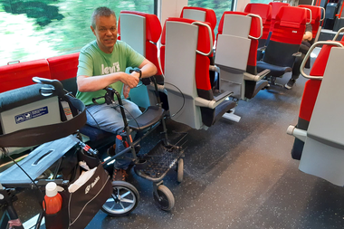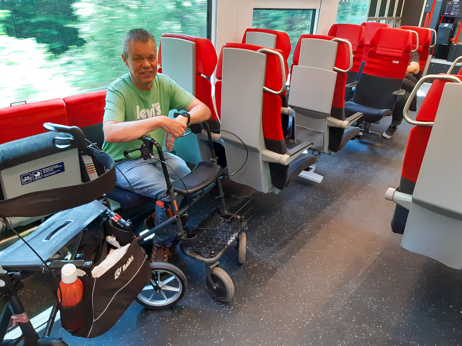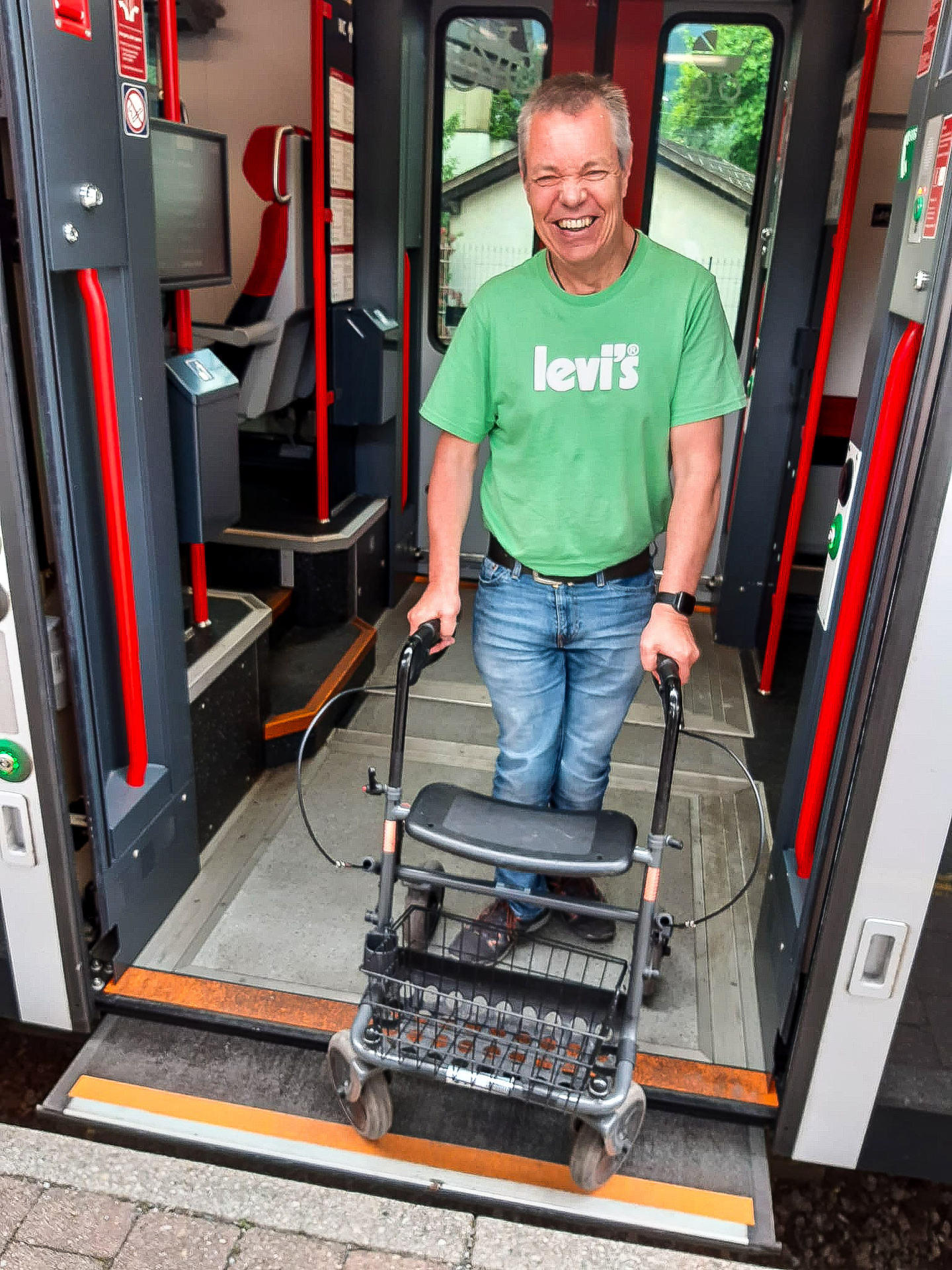 An einem sonnigen Frühsommertag habe ich mich entschieden, gemeinsam mit meiner Lebensgefährtin Elisabeth, die ebenfalls eine Gehbehinderung hat, von Rankweil nach Schruns zu fahren, und zwar mit öffentlichen Verkehrsmitteln. Ich war an diesem Tage mit einem Rollator unterwegs.