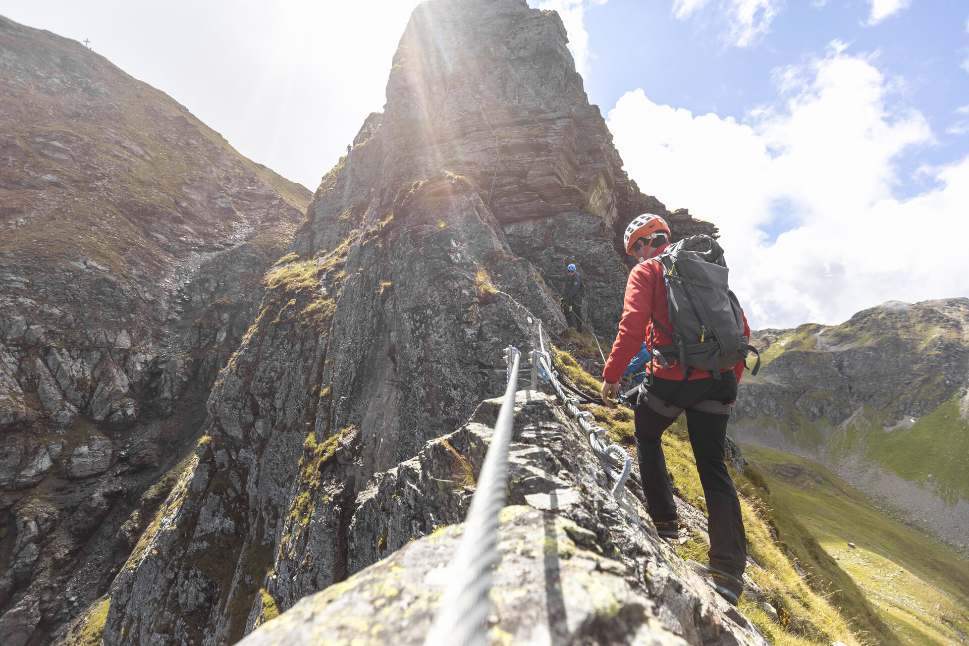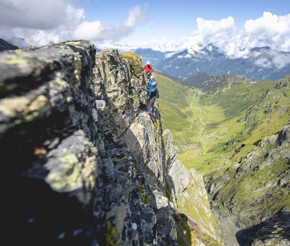 Ist der geschafft, läuft die Sache. Neues Seil, neue Stahl- und viele natürliche Tritte sowie griffiger Fels: Das macht jeden Meter zum puren Vergnügen. Trotzdem zieht sich die Sache. Noch einmal ums Eck und noch eine Wand, und schon läppern sich die Minuten zu Stunden. Dafür wartet auf jedem der blumenbewehrten Grate eine kleine Ruhebank. Trotzdem sei empfohlen, sich die Kräfte einzuteilen, denn die schwierigen Stellen befinden sich im letzten Abschnitt. Dafür sind es vom Ausstieg dann nur noch fünf Gehminuten zum Gipfelglück, das eine herrliche Fernsicht beschert. Wer also die sommerlichen Touristenströme umgehen will und Klettersteige mag, der kann die Madrisella von einer ganz neuen, sehr alpinen Seite kennenlernen.