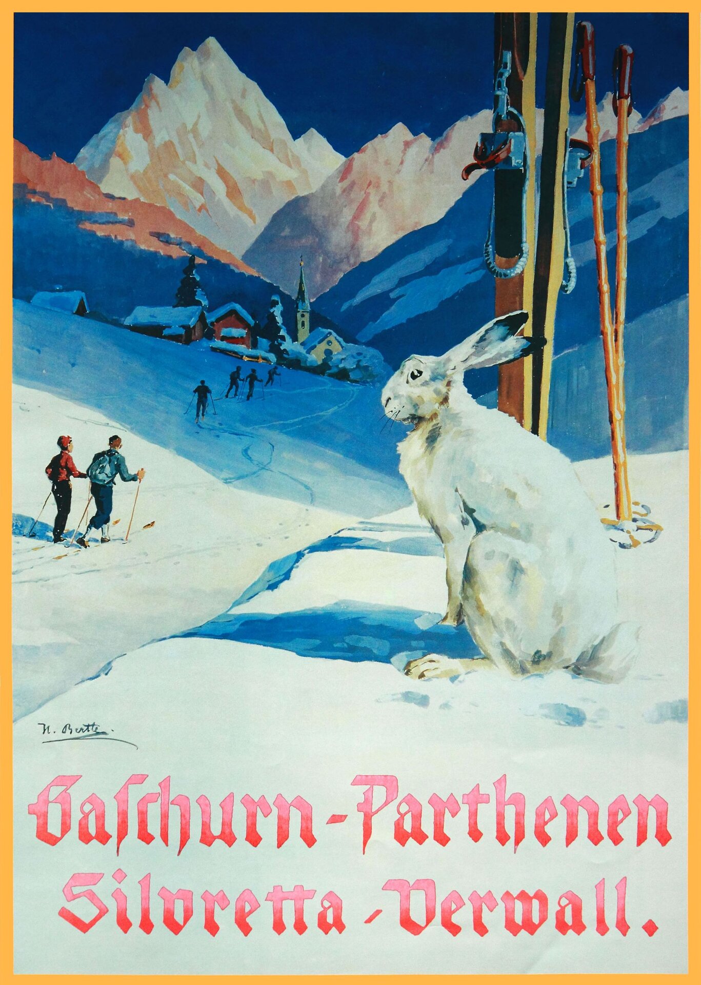 Ein Meilenstein in der touristischen Werbung für die Wintersaison war 1909 die Herausgabe des ersten "Winter-Prospektes" für das Montafon. Dabei entstand mit dem Motiv "Skifahrer", mit dem in erster Linie Schruns beworben wurde, das erste historische Werbeplakat des Tals. Dieses wurde von dem bekannten Montafoner Künstler Hans Bertle gestaltet. Anlass dafür waren die "1. Vorarlberger Schimeisterschaften", die 1910 am Golm veranstaltet wurden.
