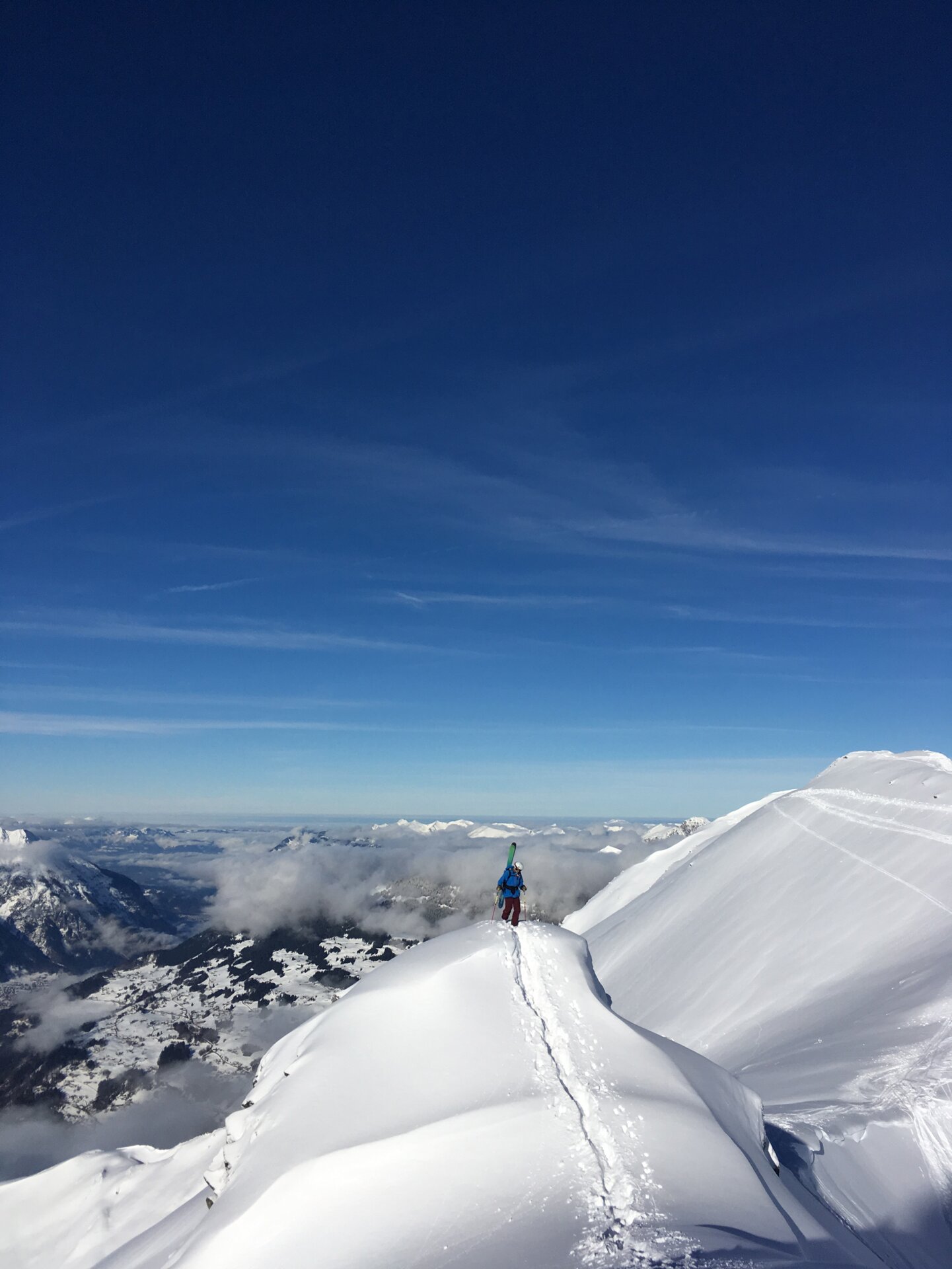 Die Hälfte konnten wir schiebend überwinden, doch an einem Punkt mussten wir dann die Ski am Rucksack festmachen und zu Fuß weiter laufen. Am Ende der Strecke gab es fürs Abenteuerfeeling noch eine kleine Kletterei am Drahtseil. Schwupps, die letzten Meter hoch zum Kreuz und der anstrengende Teil war geschafft.