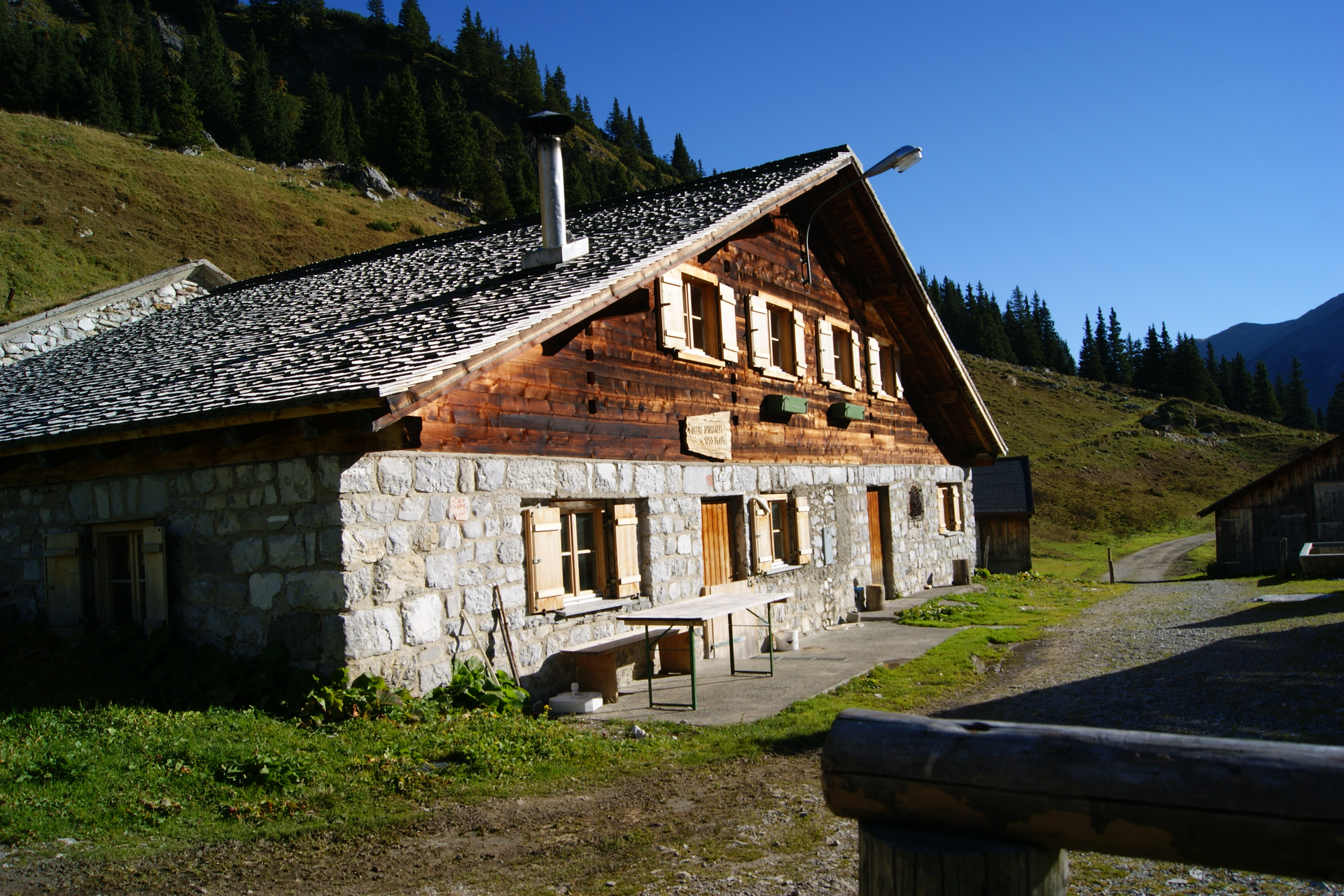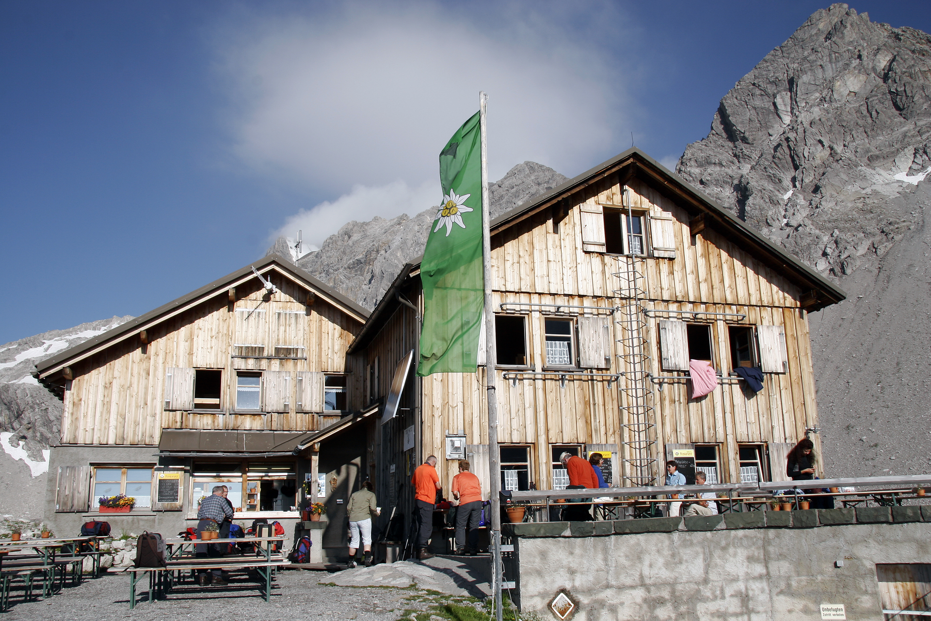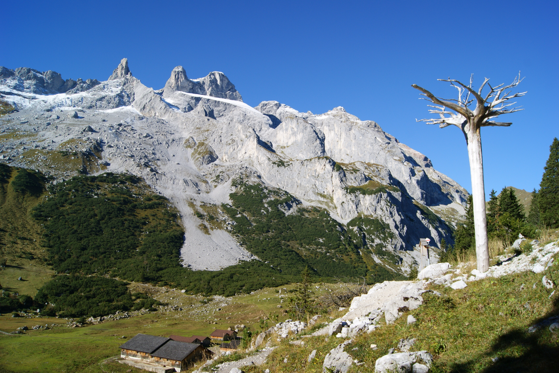 From the Lindauer Hut, the path first leads to the nearby Spora Alpe. At the foot of the limestone mountains "Three Towers" and "Drusenfluh", the path leads towards Lünersee. After about 450 meters of elevation gain or 1.5 hours, you reach the Öfen Pass. 30 minutes later you reach the "Swiss Gate" transition. An old customs house sits here by the roadside. To the right of the "Swiss Gate" are the Kirchlispitzen, a hotspot for daring sport climbers from all over the world. The path then leads back up to the Verajoch (2,323 m). On the descent from Verajoch, you can already see the Lünersee after a short time. At the Lünersee is the Lünersee Alpe. Turn left here, after about 500 m past a mountain stream the path leads up to the Totalp Hut. From the Lünersee Alpe, it is still about 1.5 hours to the Totalp Hut.
