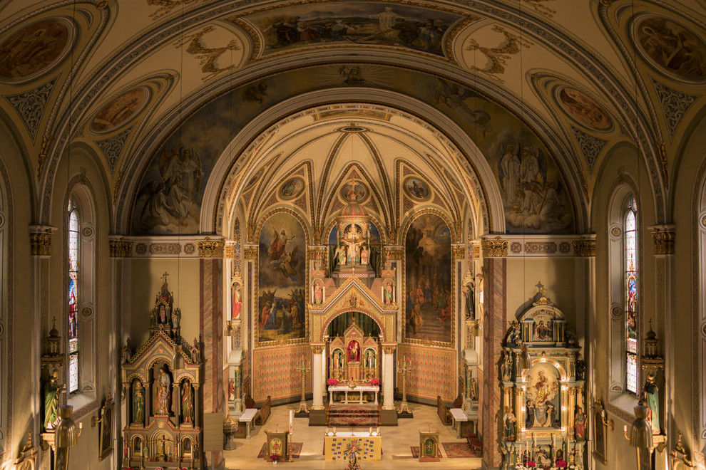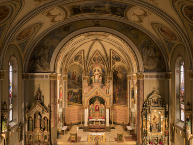 The church was built in 1865. It houses neo-Roman altars, paintings in the Nazarene style as well as numerous paintings (on both sides of the high altar, on the choir ceiling) by Franz and Jacob Bertle from the Bertle family of painters in Schruns. Hans Bertle (son of Jakob Bertle) created five ceiling paintings in the nave and the medallions above the windows. The carpenter Anton Bertle and the sculptor Ignaz Bertle are responsible for the design of the pulpit.