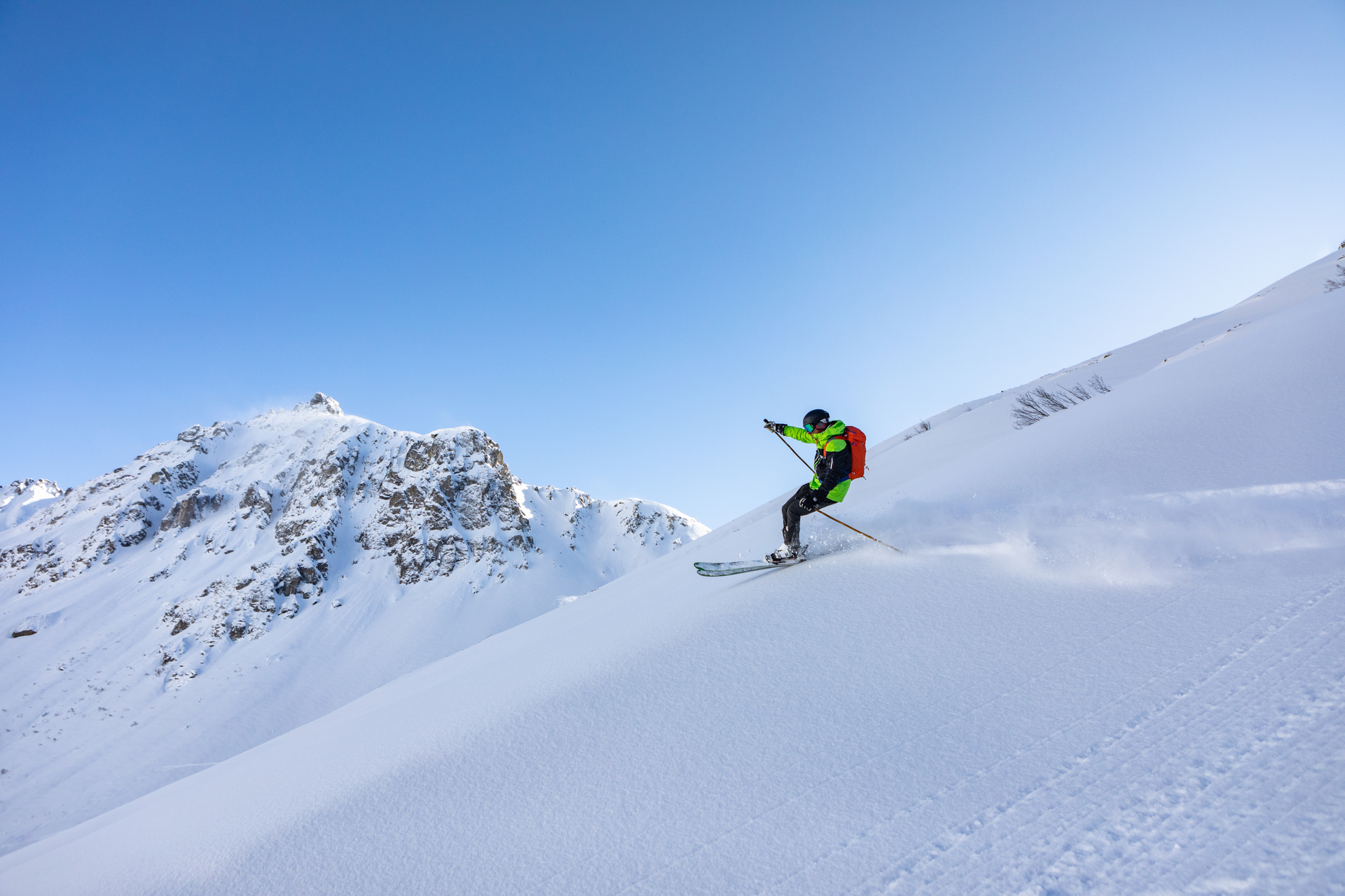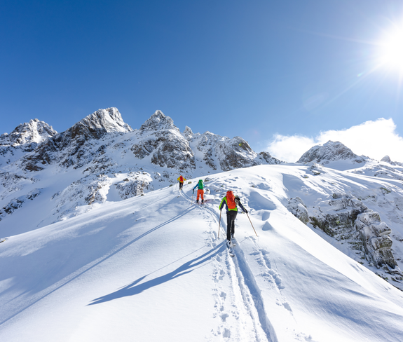 Ski touring skis, skins, possibly crampons, ski poles, ski helmet, avalanche equipment with transceiver, avalanche probe and shovel, ski touring backpack (approx. 30 liters) with avalanche airbag and rain cover, ski touring boots, ski socks, warm and durable clothing in a layering system, ski touring jacket and pants, light gloves for the ascent, warm gloves for the descent, hat/headband, possibly ski goggles, sun and rain protection, provisions and drinking water, thermos bottle with hot beverage, first aid kit, pocket knife, mobile phone, headlamp and reflectors, map material, bivy sack and rescue blanket