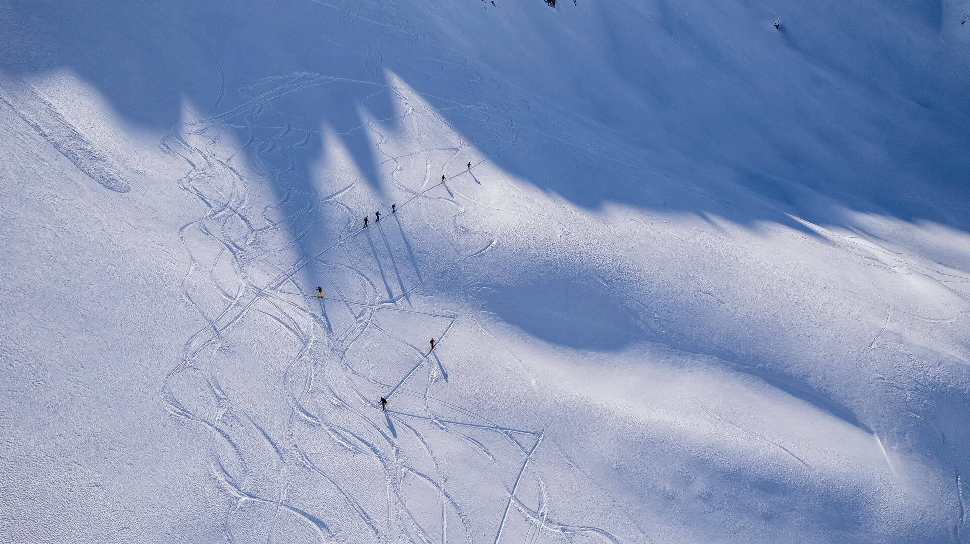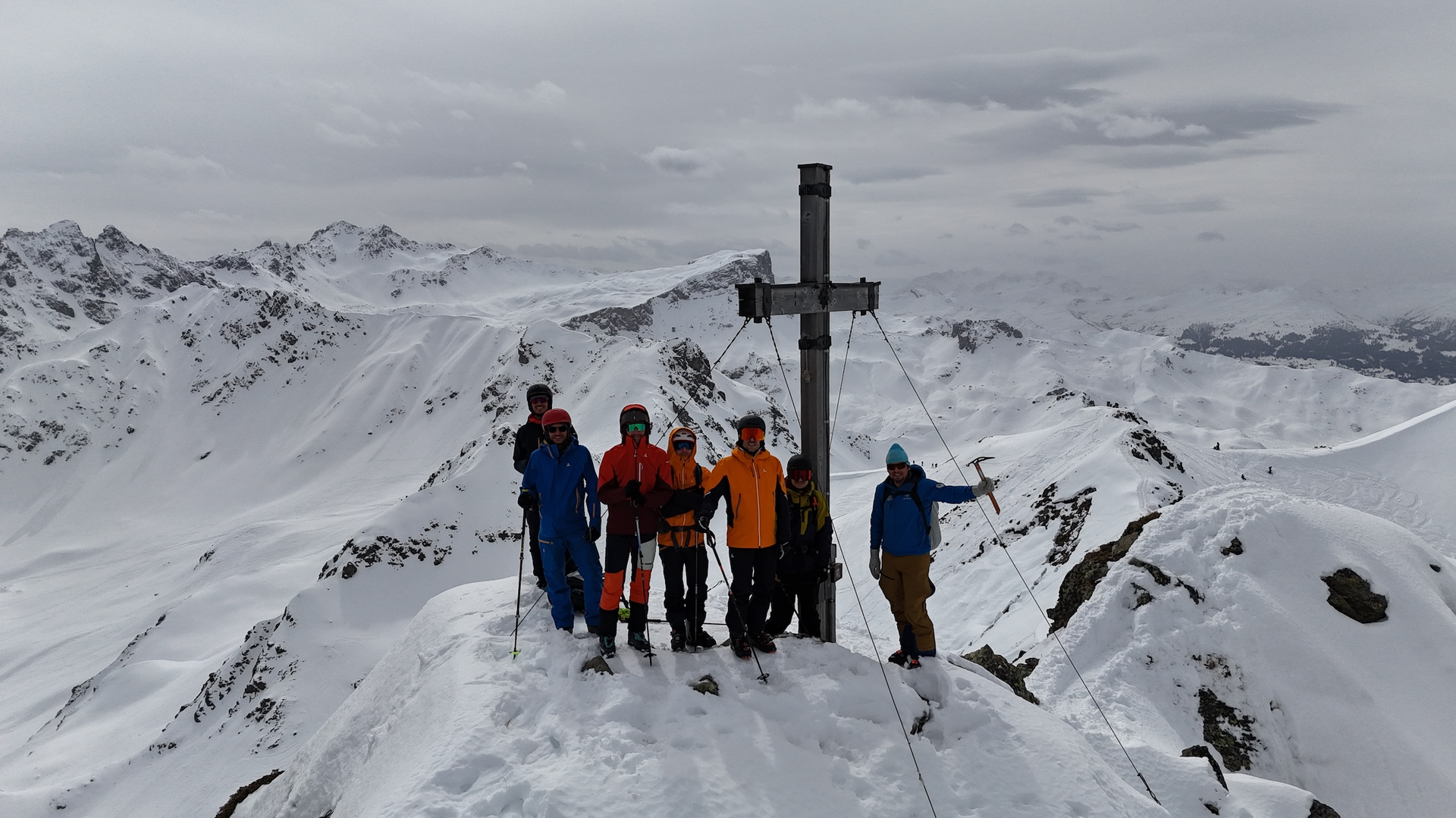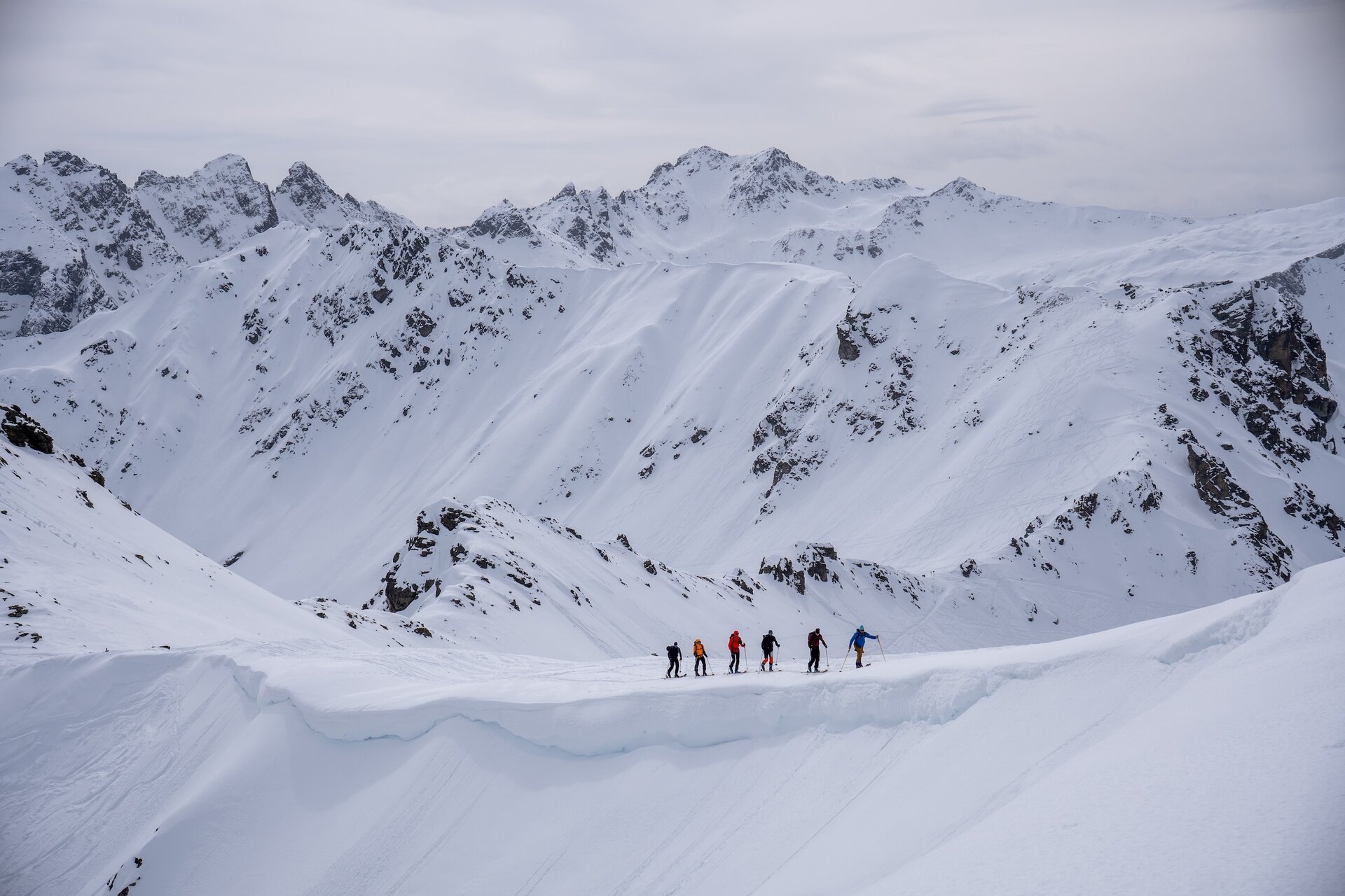 Zunächst nehmen wir die Bergbahn in Gargellen und steigen dann auf zum St. Antönier Joch. Von dort führt uns Martin auf einem Grat entlang bis wir für eine kurze Abfahrt nach Süden in die Schweiz abfellen. Um zurück nach Österreich zu kommen, müssen wir die Ski kurz schultern und wir stapfen auf in einer westlichen Scharte. Nach einer weiteren Abfahrt beginnt der seichte Schlussanstieg zum Riedkopf. Kurz vorm Gipfel legen wir ein Skidepot an und wandern auf einem aufgesetzten Grat zum Gipfelkreuz. Für die Abfahrt zurück nach Gargellen zeigt uns Martin eine tolle Variantenabfahrt.  Kurze Zeit später sind wir zurück im Hotel Bradabella.