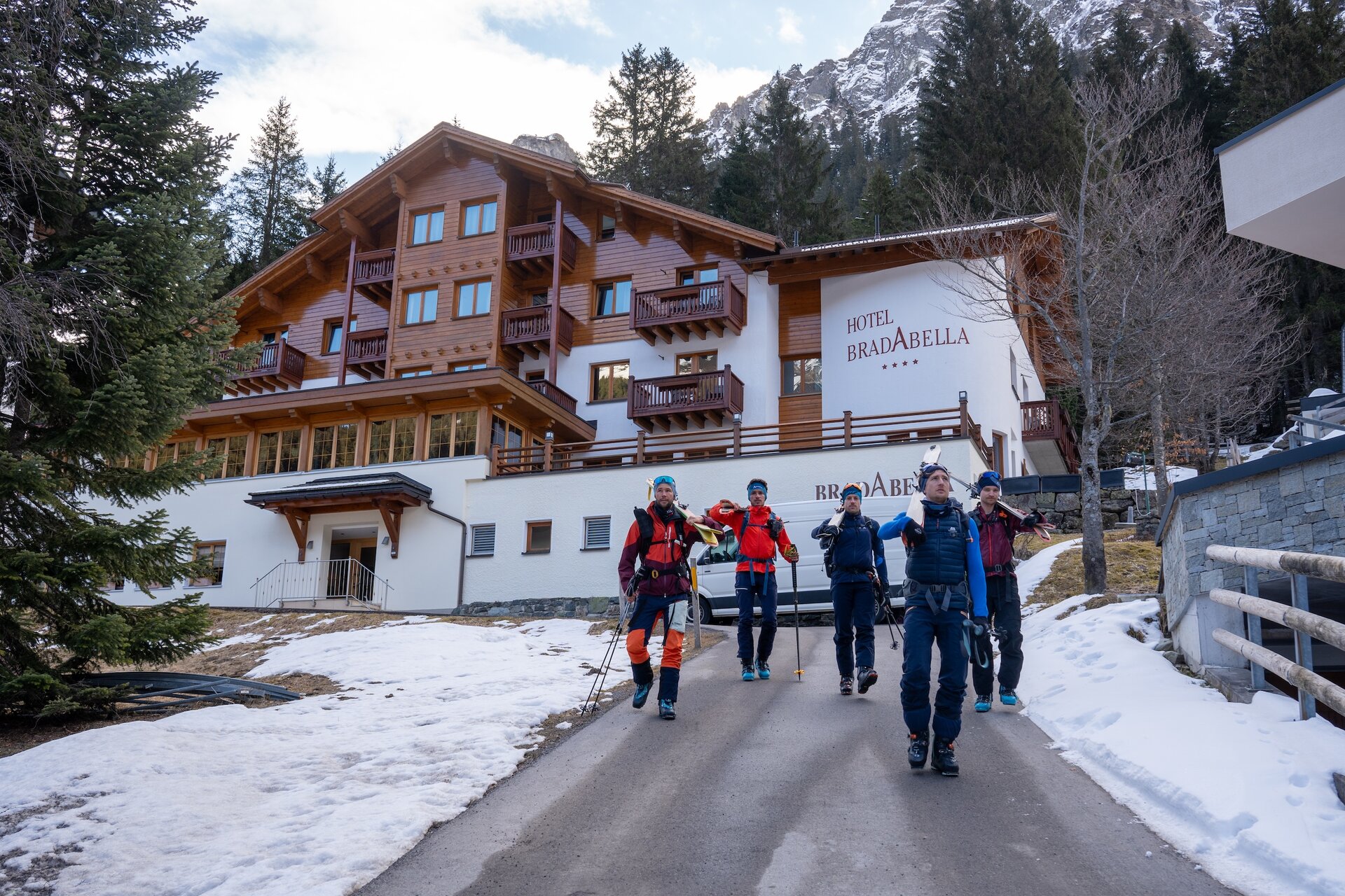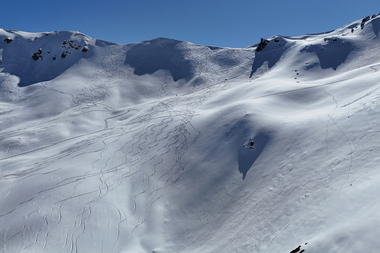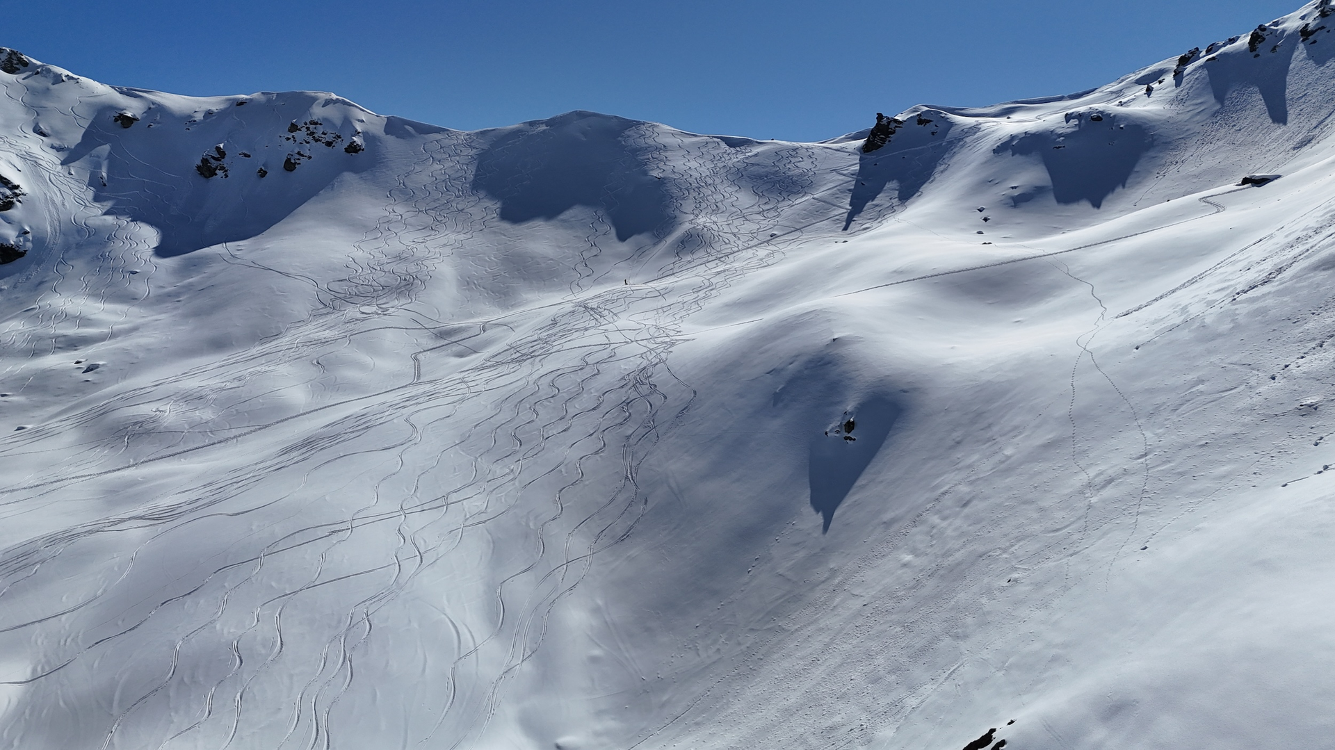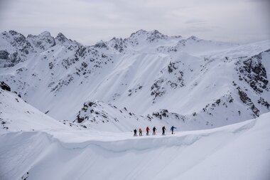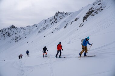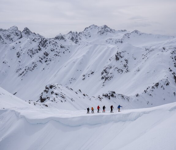 Zunächst nehmen wir die Bergbahn in Gargellen und steigen dann auf zum St. Antönier Joch. Von dort führt uns Martin auf einem Grat entlang bis wir für eine kurze Abfahrt nach Süden in die Schweiz abfellen. Um zurück nach Österreich zu kommen, müssen wir die Ski kurz schultern und wir stapfen auf in einer westlichen Scharte. Nach einer weiteren Abfahrt beginnt der seichte Schlussanstieg zum Riedkopf. Kurz vorm Gipfel legen wir ein Skidepot an und wandern auf einem aufgesetzten Grat zum Gipfelkreuz. Für die Abfahrt zurück nach Gargellen zeigt uns Martin eine tolle Variantenabfahrt.  Kurze Zeit später sind wir zurück im Hotel Bradabella.