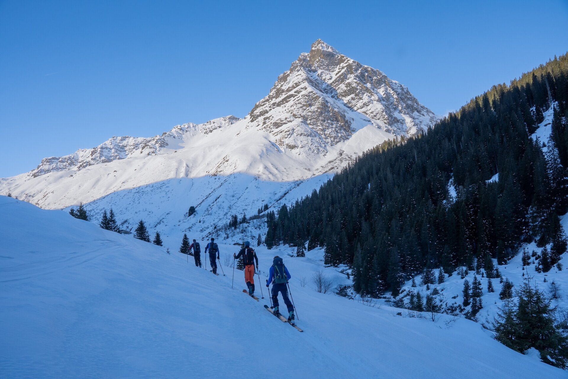 Besser hätte es nicht starten können. Auf unserer Anreise gestern hat es 30cm frischen Neuschnee geschneit. Heute ist keine Wolke am Himmel. Wir starten früh, schon vor Sonnenaufgang. Nur 100m von unserem Hotel entfernt können wir die Ski anschnallen und es geht von Gargellen aus Richtung Osten ins Vergaldner Tal. Nach 5km seichter Steigung  geht es in die Höhenmeter über Nordhänge bis hinauf zum Schneeberg. Die Tour ist technisch nicht all zu schwierig und kommt ohne anspruchsvolle Spitzkehren aus. Der Gipfel belohnt mit fantastischen Ausblicken. Obwohl es eine beliebte Tour ist und bereits einige Abfahrtspuren im Schnee sind, finden wir noch reichlich unverspurte Stücke, wo wir feinste Schwünge in den Tiefschnee setzen können. Rechtzeitig zum Kuchen Buffet auf der Sonnenterasse unseres Hotels sind wir zurück.  Ein sehr vielversprechender Einstieg.