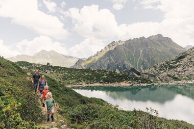 The path: A wide, relaxed gravel path leads to the picturesque reservoirs - a leisurely hike, almost like a long walk. The view of the emerald-green Lake Ganda and the Valzifenztal valley is fantastic. You can take a leisurely stroll here - even with a baby carriage.