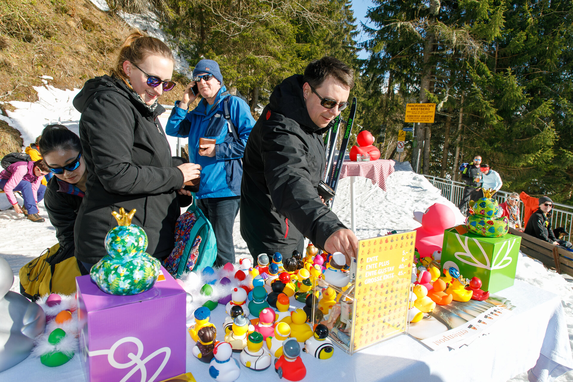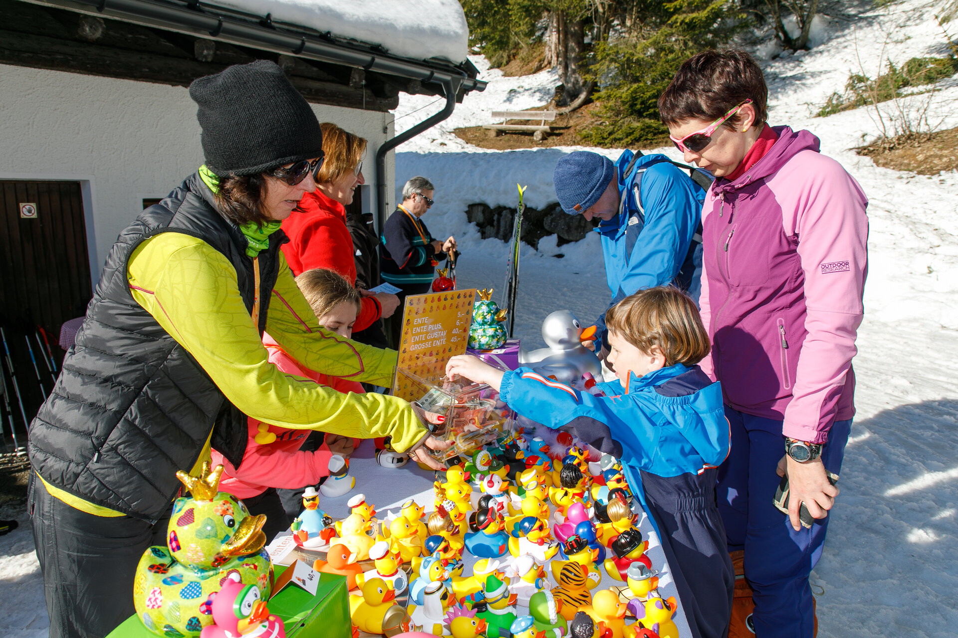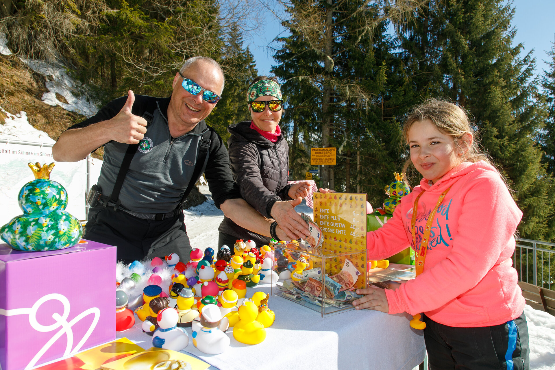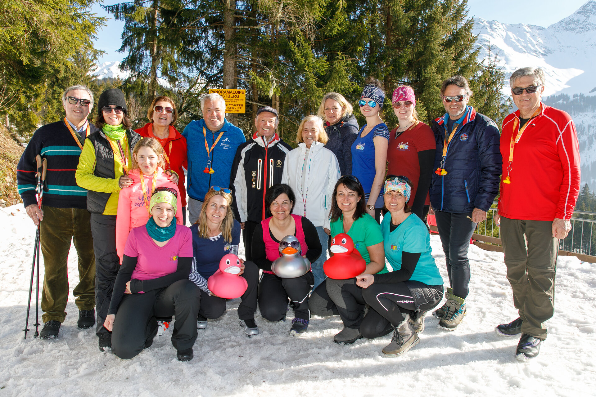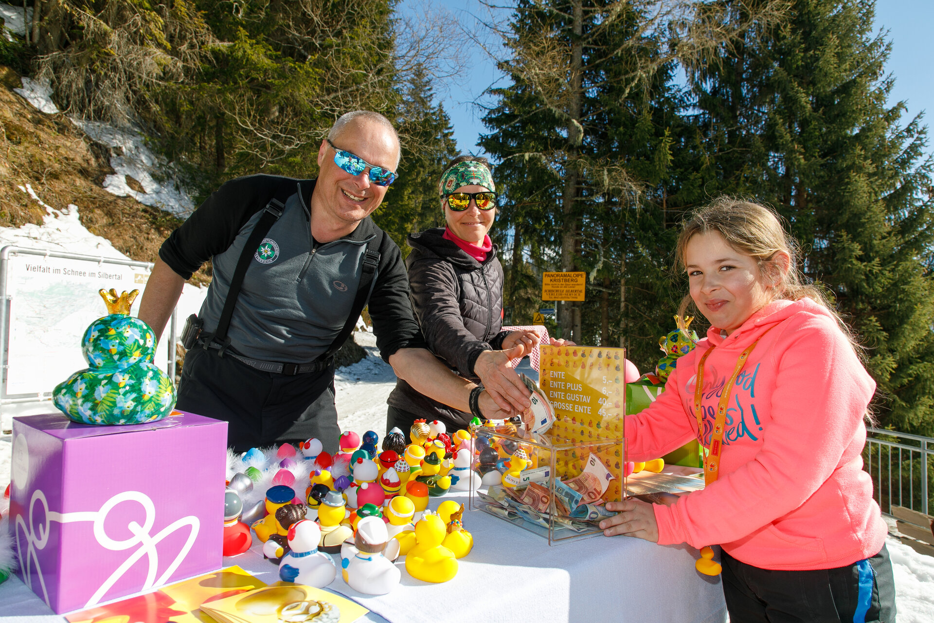 Bei der Bergstation der Montafoner Kristbergbahn war das Team vom „Netz für Kinder“ und Jürgen Zudrell stationiert. Hier gab es neben der "kostenfreien" Langlaufausrüstung auch verschiedene Tee´s, Säfte, Wasser und jede Menge bunte "Enten", das Symbol vom „Netz für Kinder“ (Ente gut alles gut :)).