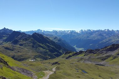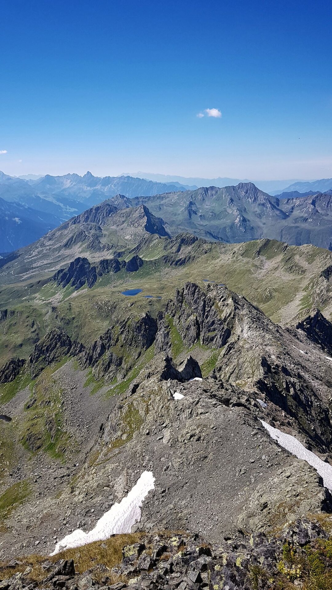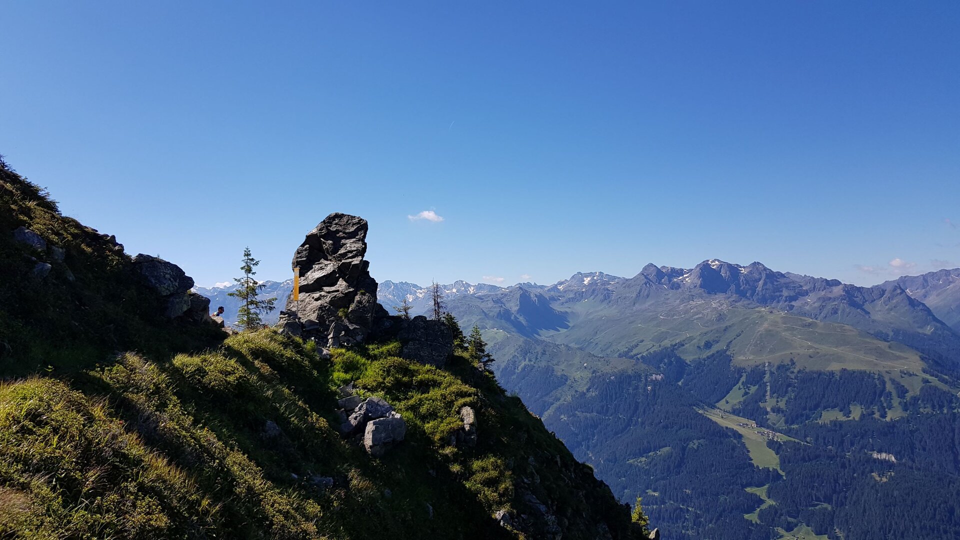 Das Silvrettagebirge mit dem höchsten Berg Vorarlbergs, dem Piz Buin, erstreckt sich imposant vor uns. Das Lechquellgebirge ist von hier aus ebenfalls gut zu sehen, sowie fast das gesamte Ländle. Durch seine isolierten Lage, versperrt uns kein anderer Berg die Sicht, lediglich das Wetter könnte uns hier ein Schnippchen schlagen.