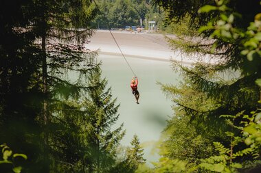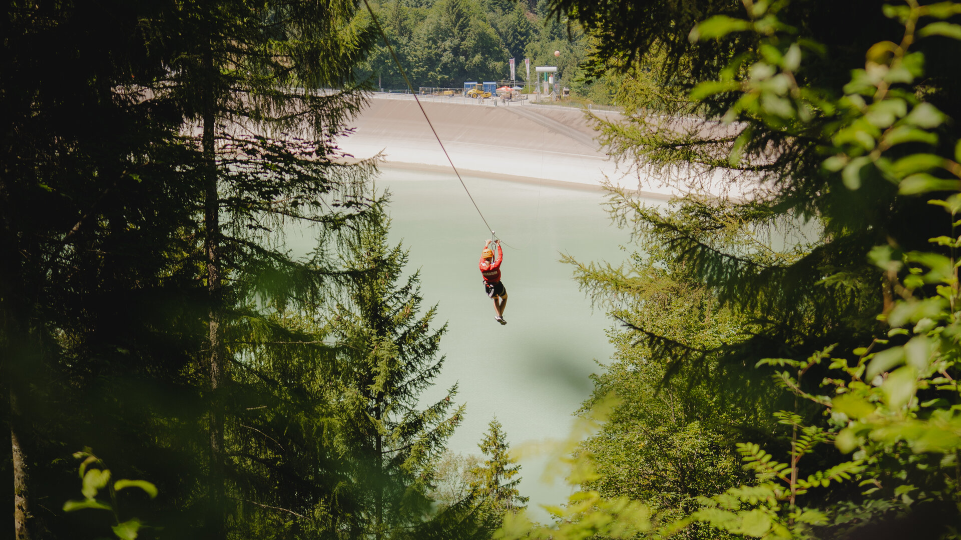 Auf dem Flying-Fox-Golm ist ein ultimativer Adrenalin-Kick garantiert. Mit bis zu 70 km/h fliegst Du an einem 565 Meter langen Stahlseil über das Staubecken Latschau. Natürlich mit Sitzgurt und Anhängevorrichtung ausgerüstet.
