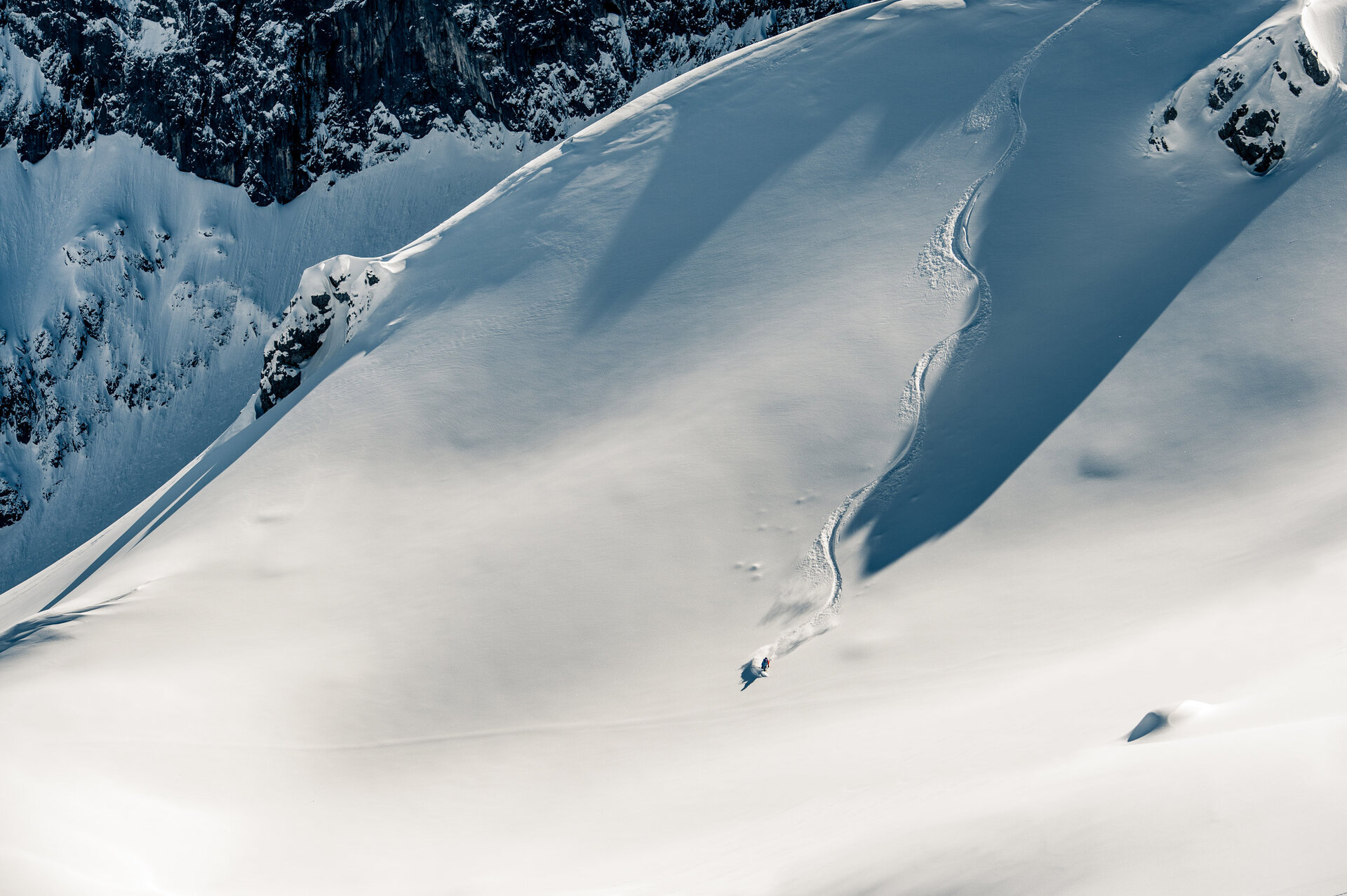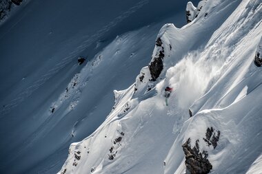 Zurück bei der Hütte schmieden wir Pläne für den nächsten Tag: Laut Wetterbericht gibt es ein blaues Fenster von der Früh weg bis um die Mittagszeit. Am nächsten Morgen geht es also los. Plötzlich erscheint die Sonne und lässt die steilen markanten Felswände in einem goldenen Licht erscheinen, auf den letzten Metern erleben wir ein ganz besonderes Naturschauspiel. Wir genießen die Aussicht in vollen Zügen und besprechen gemeinsam die besten Lines! Es erwarten uns top to bottom first tracks bei perfekten Verhältnissen. Einfach nur genial die Abfahrt.