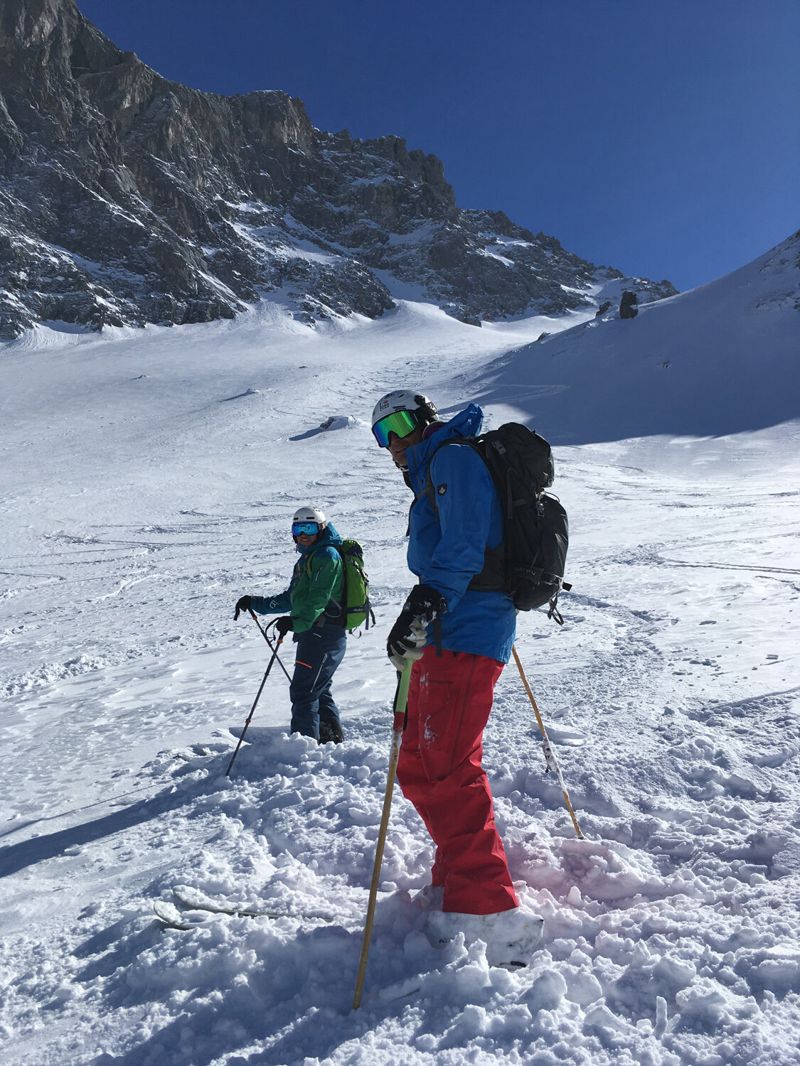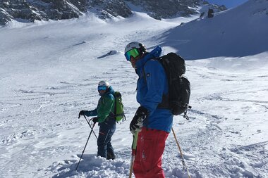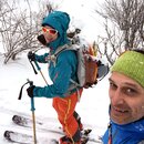 Mit breitem Grinsen im Gesicht stürzten wir uns gegen 10:30 Uhr nacheinander die etwas steilere, aber sehr breite Nordrinne hinunter. Sie war genau nach unserem Geschmack: Wunderbar griffiger Schnee, etwas ausgefahren, hier und da ein Buckel.