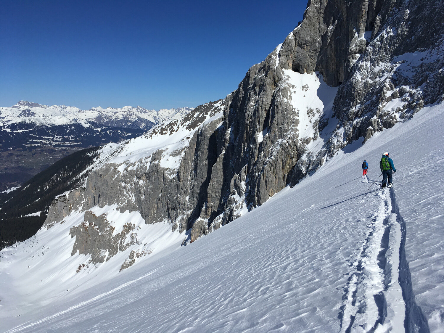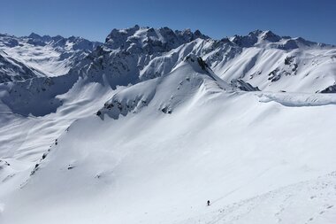 Mit Blick auf die Uhr beschlossen wir daraufhin jedoch das Gipfelkreuz auszulassen und lieber auf einen anderen Tag zu verschieben. Doch selbst vom Riedkopfjoch aus hatten wir einen guten Blick auf ein paar der mächtigen Rätikon Gipfel wie z.B. Wiss Platte, Sulzfluh und Drei Türme. Und natürlich auf die erste lange Abfahrt des Tages: gute 700 Höhenmeter und 4 Kilometer hinunter Richtung Partnunstafel.