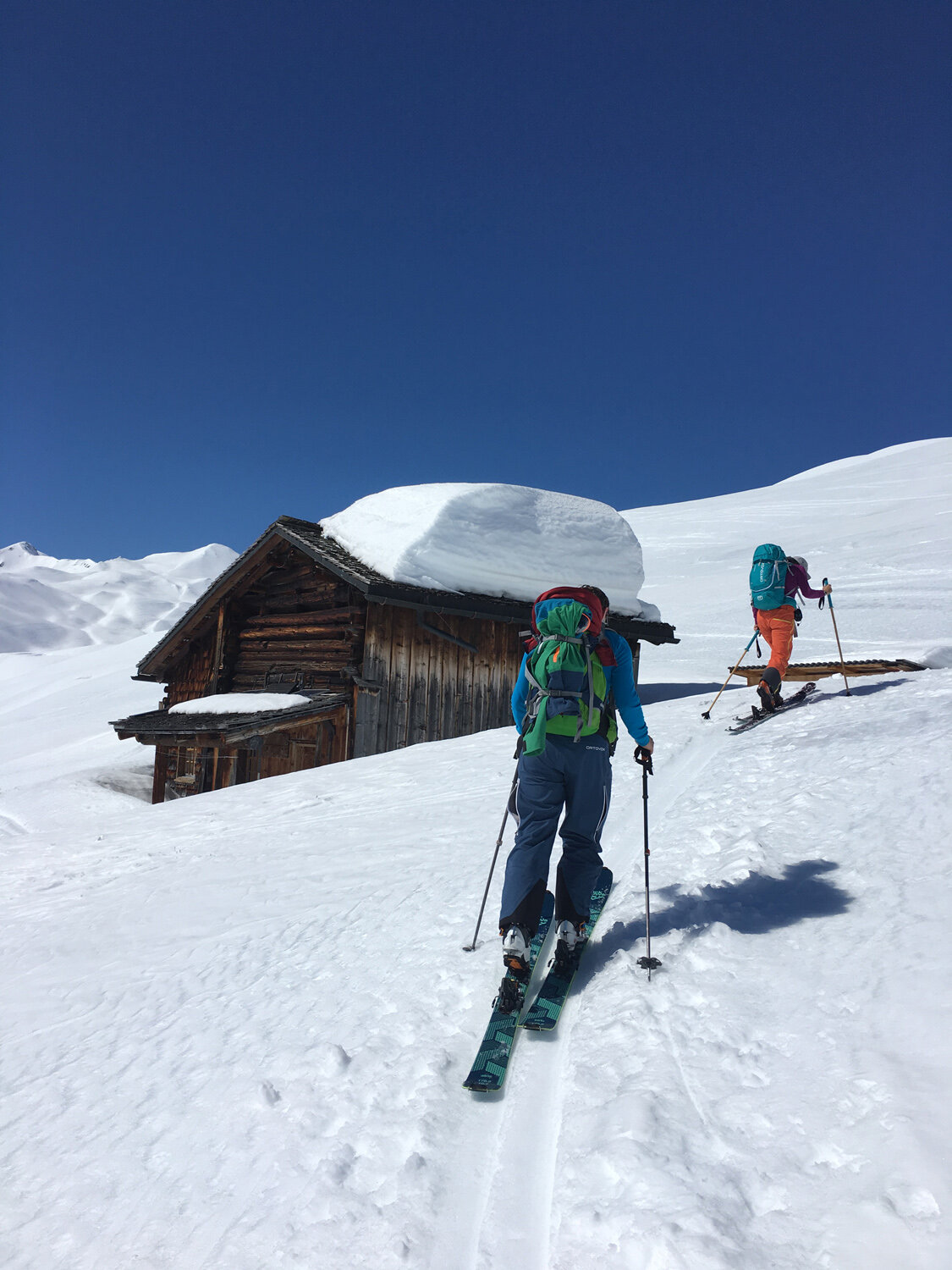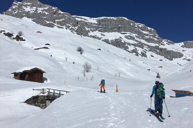 Danach folgten wir den langen, sanft kupierten Hängen (je nach Himmelsrichtung pulvriger bis knuspriger Schnee) und dem Talboden in westliche Richtung. Um keine Höhenmeter zu verlieren, traversierten wir auf der rechten Teilseite oberhalb von Partnun mit seinen tief verschneiten Dächern bis zum Berghaus Alpenrösli. Deren verlockende Terrasse mussten wir sprichwörtlich links liegen lassen.