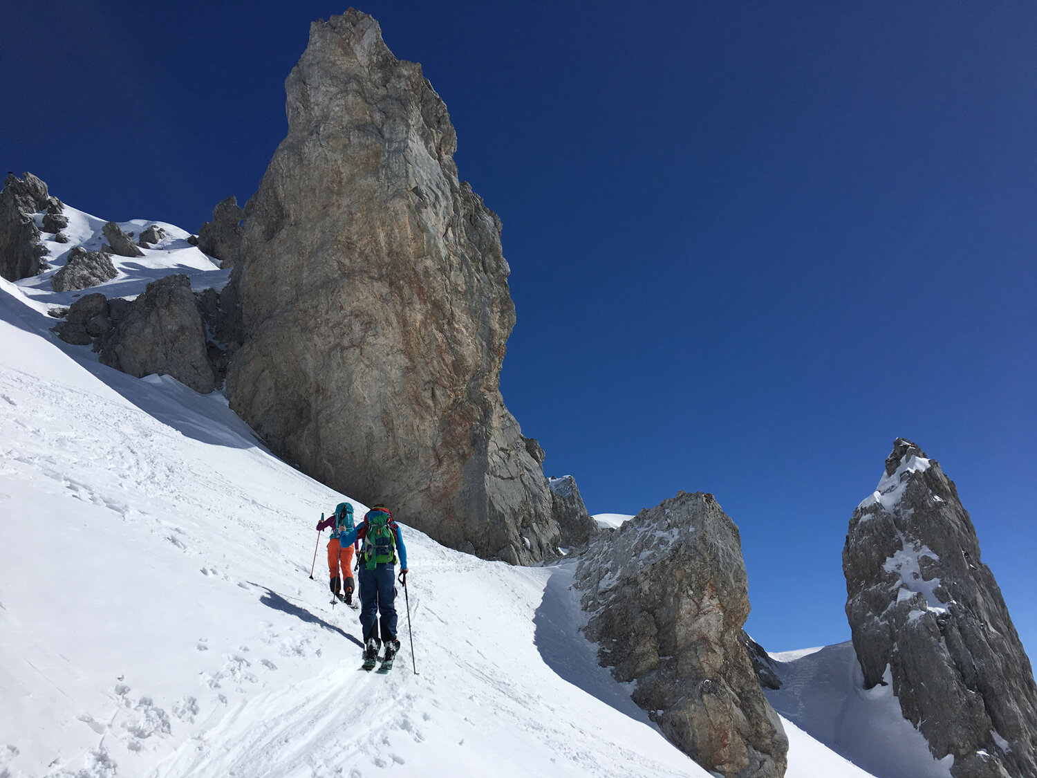 Landschaftlich spannend, führte er uns zwischen schroffen Felsformationen hindurch, immer die so völlig anders aussehende Rückseite der Drei Türme im Blick. Als wir gegen 14:00 Uhr die Grenze nach Österreich überschritten, war die Freude groß, denn im Geiste sahen wir uns schon beim kühlen Radler relaxen... Doch zuvor gab es erst noch die wohlverdiente Belohnung in Form eines langen, nordseitigen Pulverschneehangs, der uns im Endorphinrausch geradewegs auf die Sonnenterrasse der Lindauer Hütte beförderte. Besser konnte es nicht laufen.