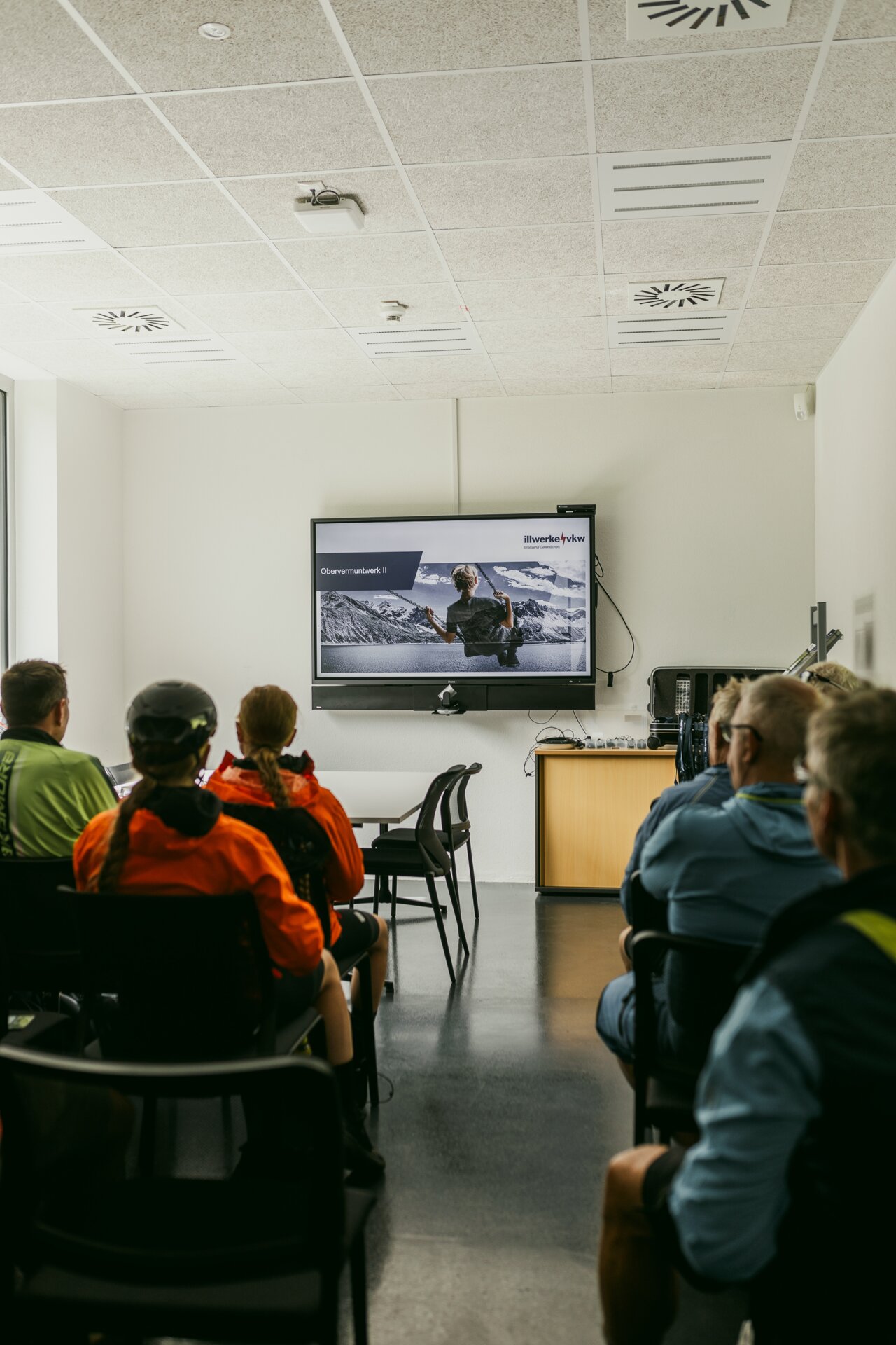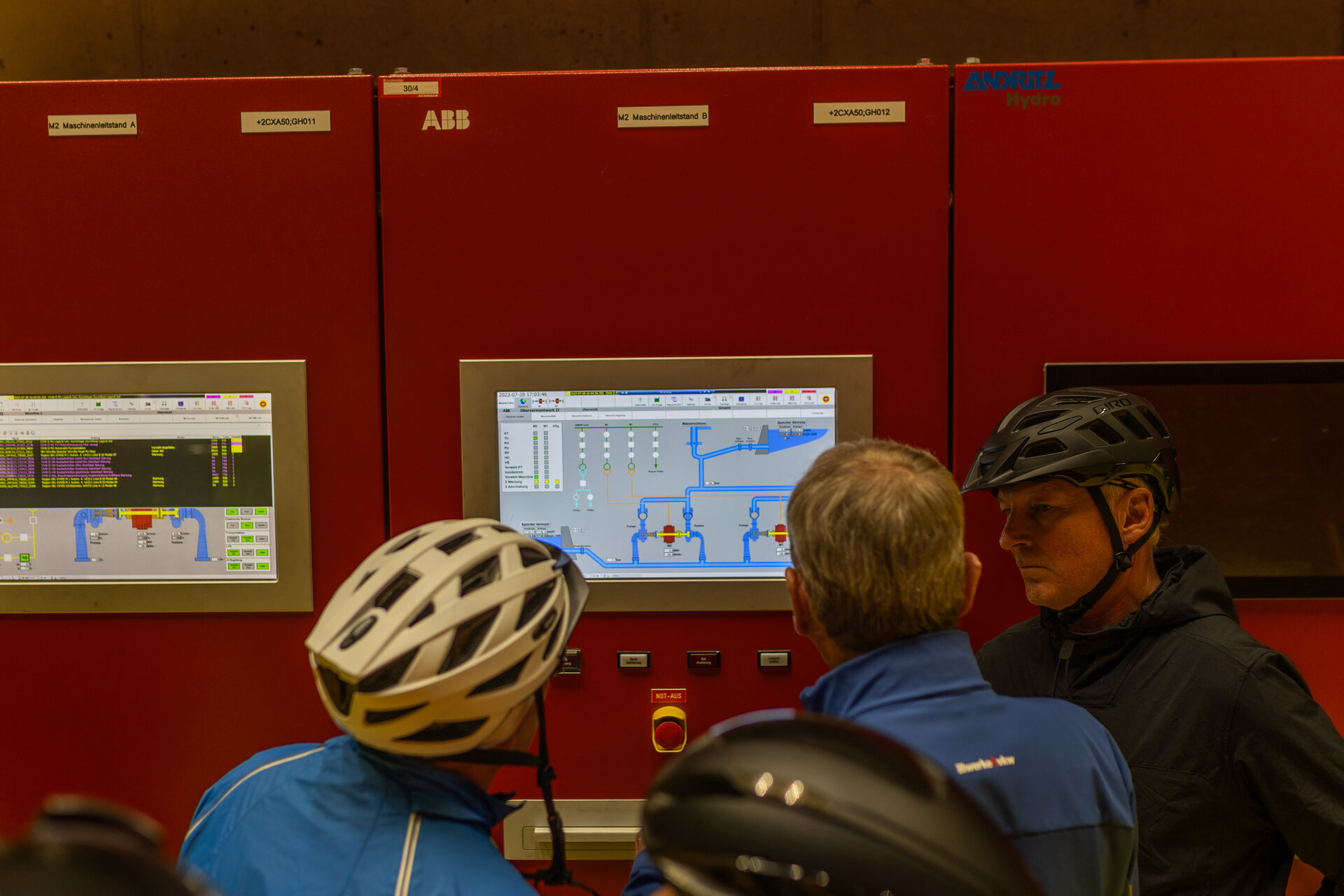 Nach ca. 16 km kamen wir bei unserem ersten Stopp an - dem Tschambreu Kraftwerk. Wir wurden herzlich begrüßt und auch mit einer Kleinigkeit zu Trinken empfangen. Als Einleitung wurde uns erklärt, dass hier nur das komplette Wasser im Bach (= Bachfassung) abgefangen und in den Kanal gepumpt wird, um dann im nächsten Tal das Wasser zur Stromerzeugung zu nutzen. Wichtig ist jedoch, dass nicht das komplette Wasser abgeschöpft wird. Ein gewisser Anteil muss in den Bach zurückgepumpt werden, das sogenannte „Tierwasser“. Wie der Name schon sagt, ist dieses Wasser dafür da, dass die Tiere im Bach weiterleben können. Bei unserem zweiten Stopp, nur zwei Kilometer weiter, haben wir einige interessante Dinge erfahren, wie z.B.: dass die Strompreise alle drei Jahre neu verhandelt werden. Die Amortisation der Maschinen war nach etwa 13 Jahren geplant, aufgrund der aktuellen hohen Strompreise geht das sogar schon ein bisschen schneller.
