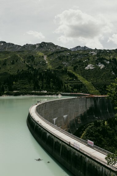 Schon von weitem sahen wir unseren dritten Stopp: der Stausee Kops. Genauer gesagt, sahen wir die riesige Staumauer, die sich beeindruckend in der Ferne abzeichnete. Einerseits schien es so, als wäre es nur noch ein Katzensprung, andererseits war es noch ewig weit weg. Wieder einmal waren wir froh, dass wir nicht alles selber strampeln mussten. Als wir oben ankamen, staunten wir nicht schlecht über den tollen Ausblick. Der blaue Stausee, umrahmt von hohen Bergen. Teilweise blitze noch das ein oder andere Schneefeld heraus, was uns immer wieder daran erinnerte, in welcher Höhenlage wir uns befinden.