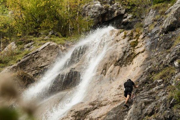 The Wasserfall via ferrata is located just above the centre of St. Anton im Montafon. Although this via ferrata is considered easy to access, it should not be underestimated. There are easy sections (difficulty level B/C) as well as two vertical and exposed key sections (difficulty level C/D) in the via ferrata. There is no emergency exit. The highlights are two suspension bridges over thundering waterfalls, fantastic views and a vertical rock face. Appropriate arm strength, a head for heights and knowledge of via ferrata climbing are essential!