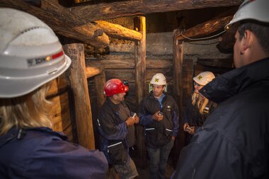 Der dritte und tiefste Einblick folgt im wahrsten Sinne des Wortes: Im historischen Bergwerk am Bartholomäberg tauchst Du ein in die Welt unter Tage. Ausgestattet mit Helm und Stirnlampe gehst Du durch enge Stollen, begleitest die Spuren des alten Erzabbaus und erfährst, wie eng Technik, Mut und Überlebenswille im Montafon miteinander verwoben waren. Das Bergwerk gilt als das älteste bekannte seiner Art in Vorarlberg und erzählt eindrücklich von einer Welt, die jahrhundertelang das Leben im Tal geprägt hat.