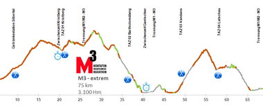 Die Strecke, die es im Rahmen des M³ zu bewältigen gilt, fordert ein hohes Fitnesslevel der Fahrerinnen und Fahrer. Mit 75 Kilometern und 2.500 Höhenmeter ist die Tour anspruchsvoll. Dabei präsentieren sich Dir die unterschiedlichsten Landschaftsbilder.